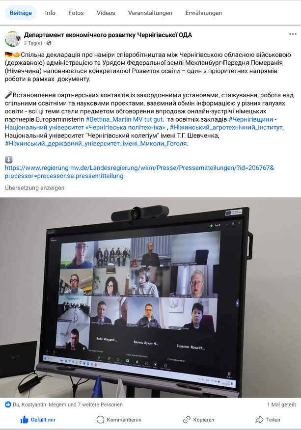 29. 11. 2024 Videokonferenz zum Aufbau einer Bildungspartnerschaft zwischen dem Bundesland Mecklenburg-Vorpommern und dem Oblast Tschernihiw.