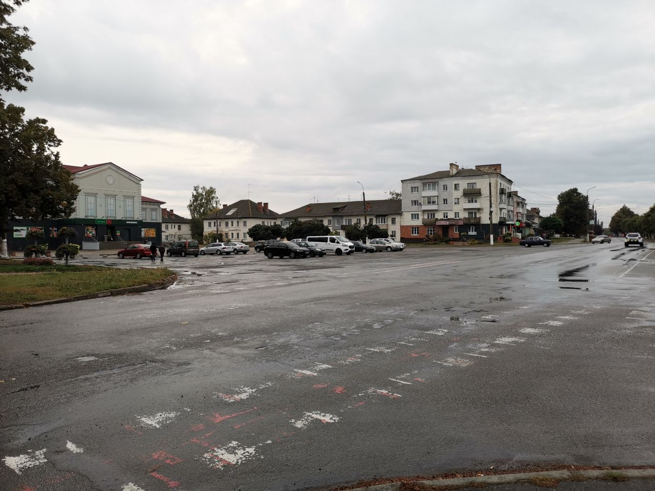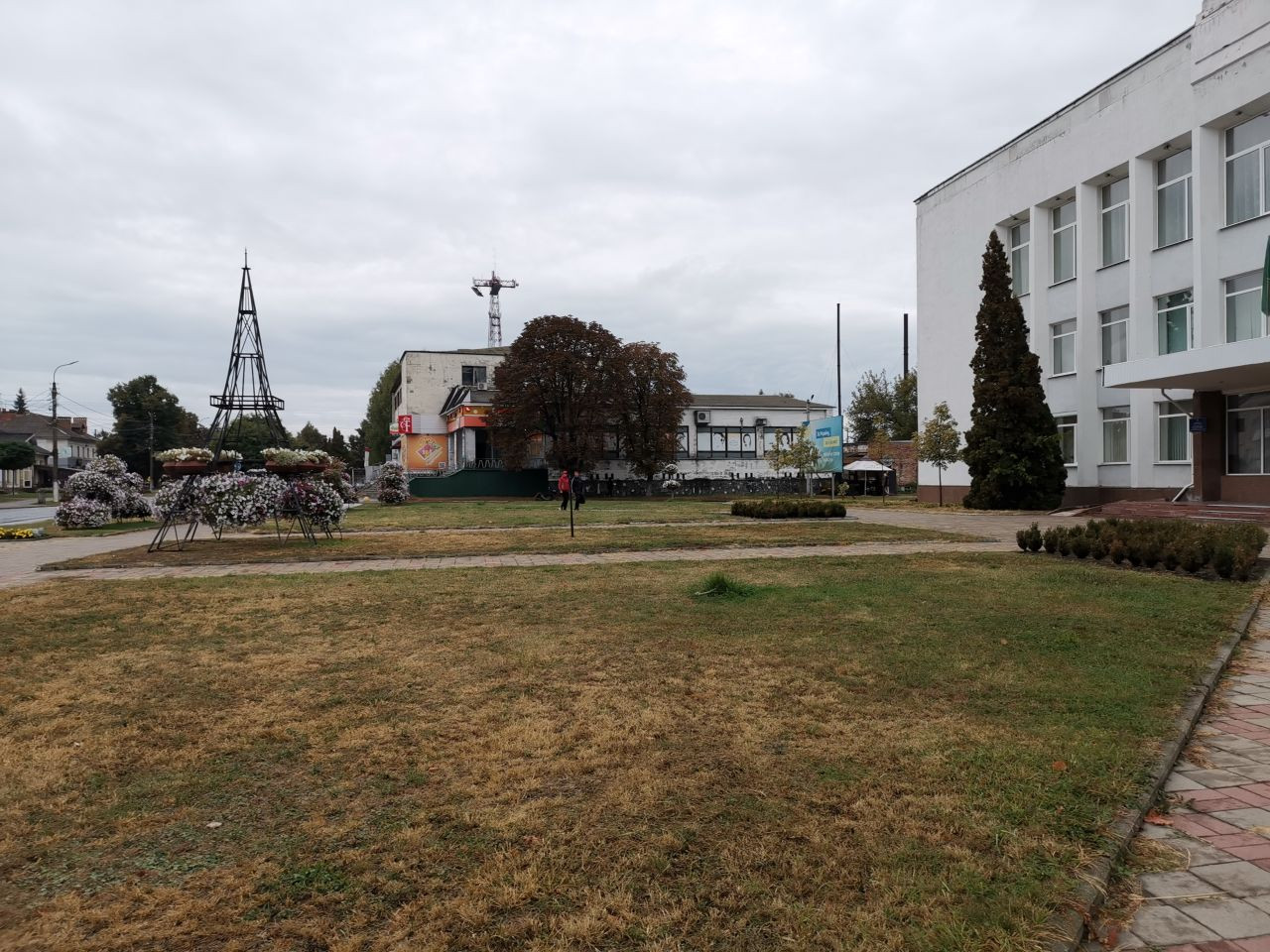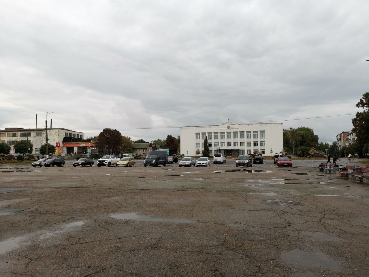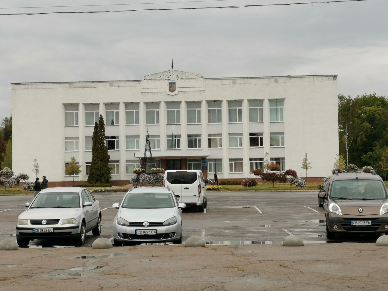 Um 12 Uhr war ich mit Volodymyr im Zentrum von Korjukiwka verabredet, wieder parke ich auf dem zentralen Platz dicht bei dem Hotel, in dem ich übernachten werde, eingerahmt zwischen dem Haus der Kreiserwaltung auf der nördlichen und einen neu hergerichteten Haus mit einem kleinen Supermarkt und anderen Dienstleitstungsangeboten auf der anderen Seite.