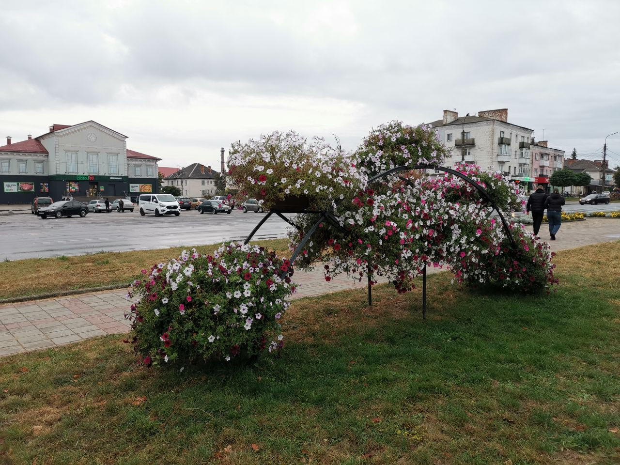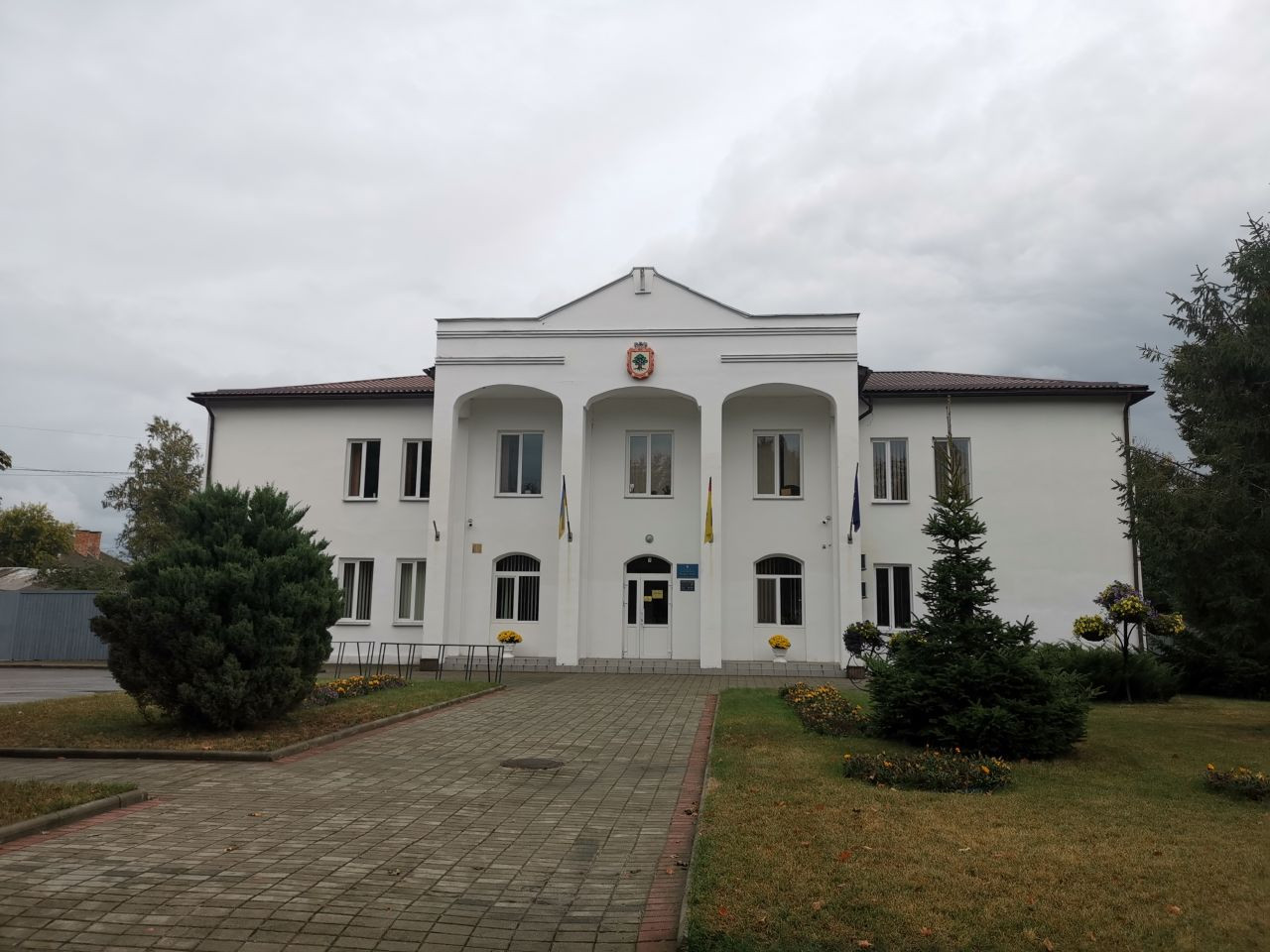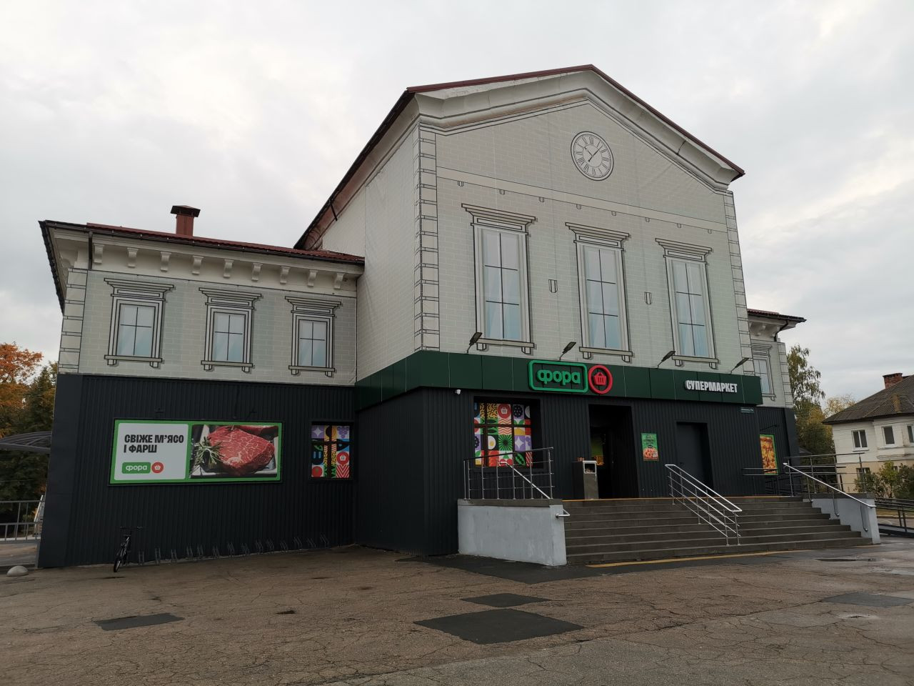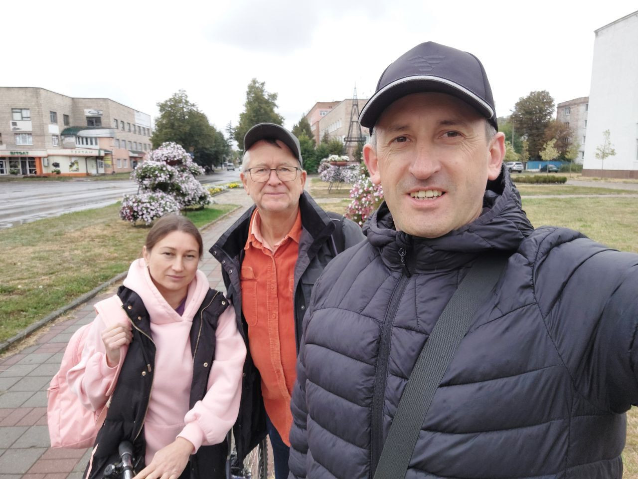 Um 12 Uhr war ich mit Volodymyr im Zentrum von Korjukiwka verabredet, wieder parke ich auf dem zentralen Platz dicht bei dem Hotel, in dem ich übernachten werde, eingerahmt zwischen dem Haus der Kreiserwaltung auf der nördlichen und einen neu hergerichteten Haus mit einem kleinen Supermarkt und anderen Dienstleitstungsangeboten auf der anderen Seite.