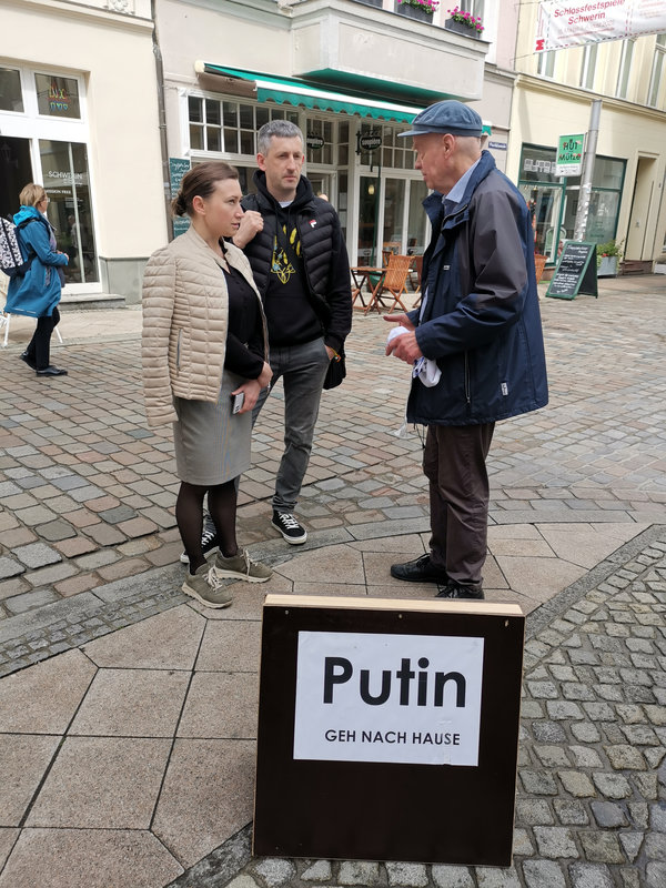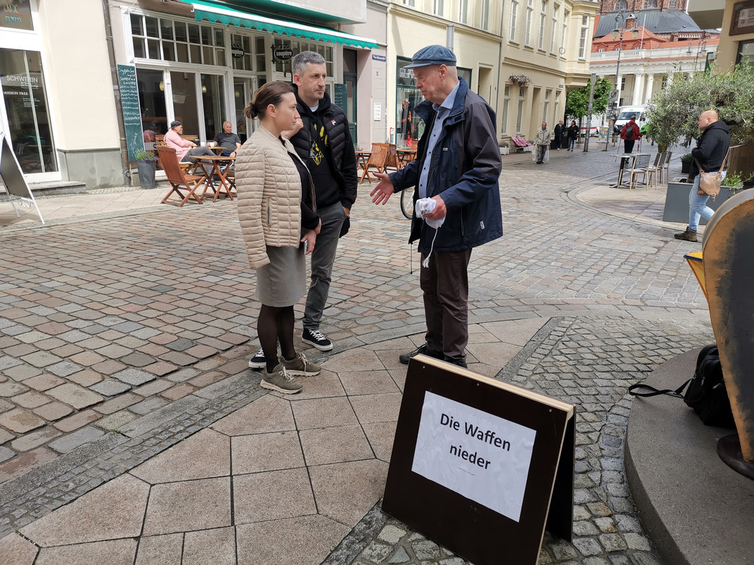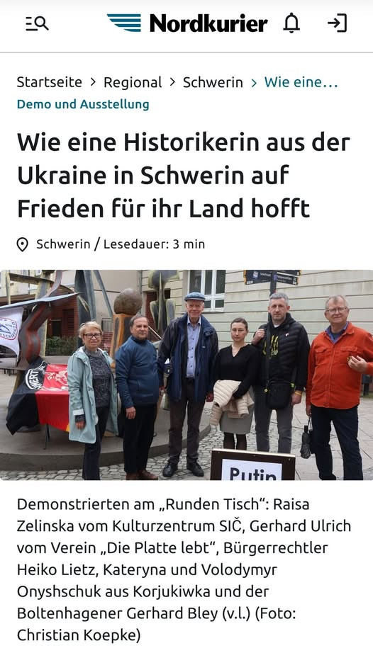 Bericht des Nordkurier über die Ausstellungseröffnung und den Besuch von Kateryna Onyshschuk in Schwerin am 28. Mai 2025 Gemeinsam mit Heiko Lietz protestieren die Besucher (Kateryna Onyshschuk, begleitet von ihrem Mann Volodymyr, in Schwerin gegen den Krieg Russlands gegen die Ukraine. „Die Waffen müssen sofort niedergelegt werden“, fordert Lietz. Durch Verhandlungen auf Augenhöhe solle der Krieg beendet werden. „Putin darf nicht die Bedingungen diktieren“, so Lietz.