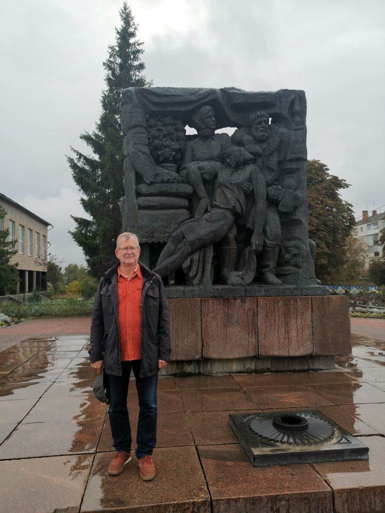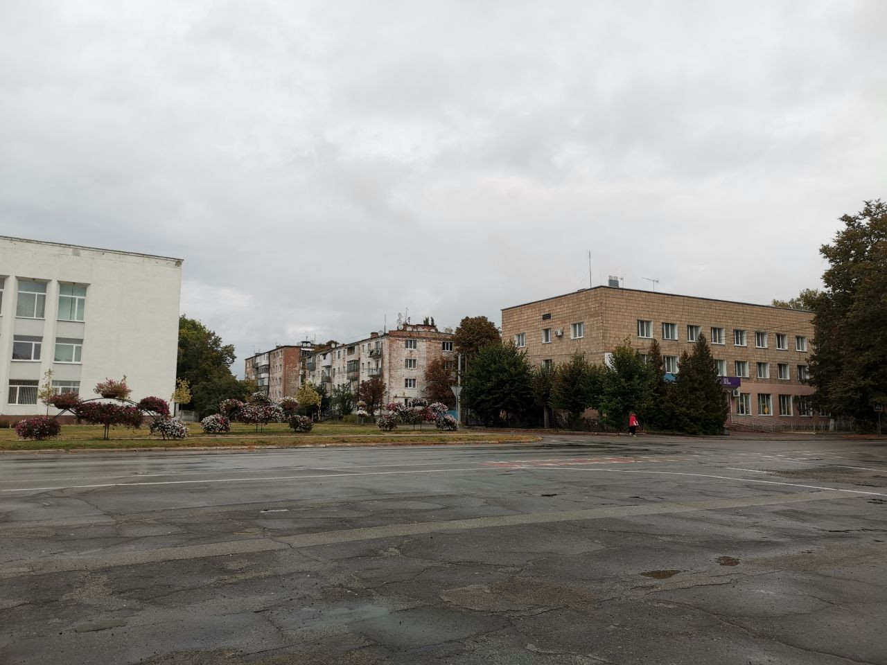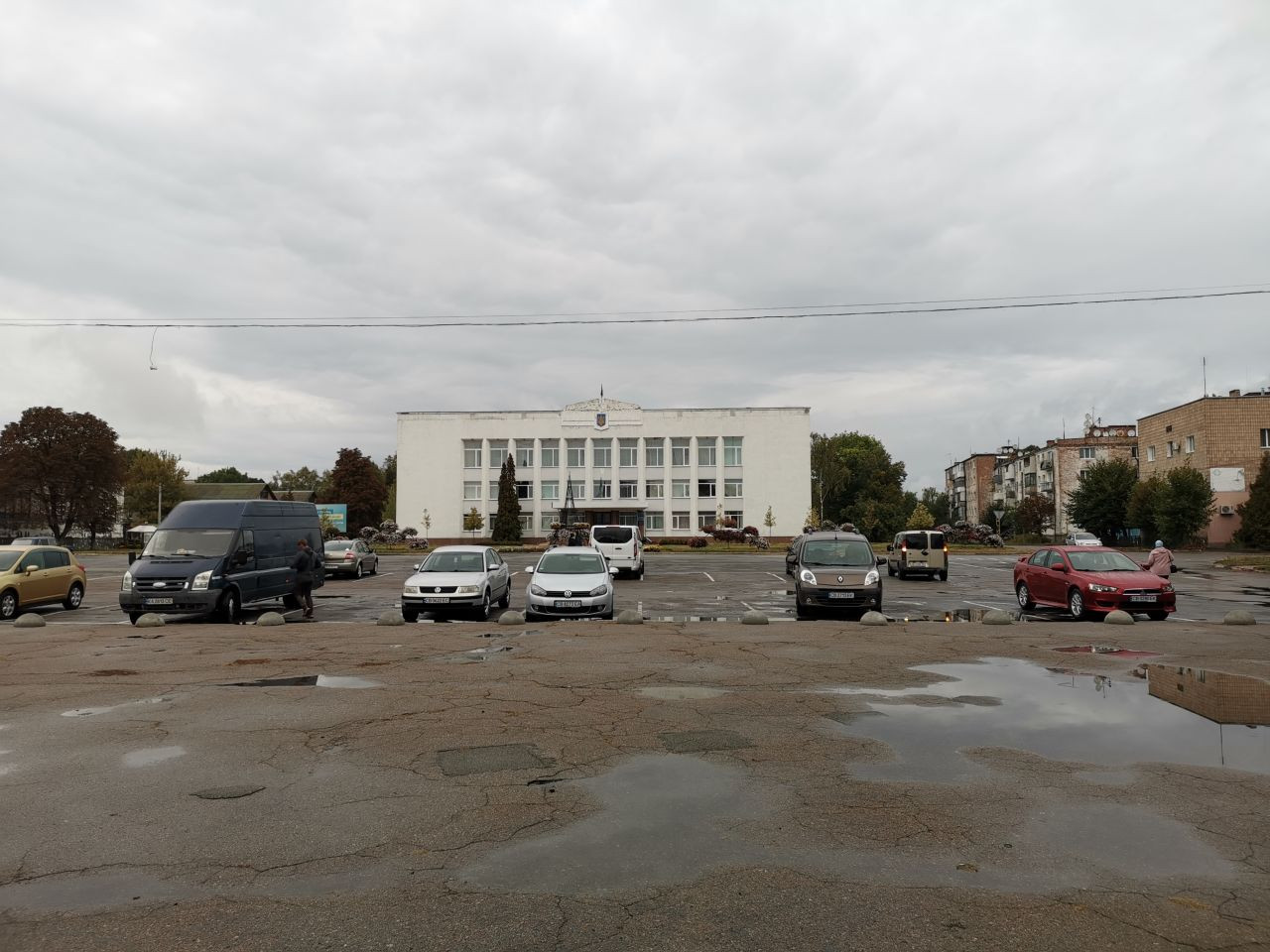 Um 12 Uhr war ich mit Volodymyr im Zentrum von Korjukiwka verabredet, wieder parke ich auf dem zentralen Platz dicht bei dem Hotel, in dem ich übernachten werde, eingerahmt zwischen dem Haus der Kreiserwaltung auf der nördlichen und einen neu hergerichteten Haus mit einem kleinen Supermarkt und anderen Dienstleitstungsangeboten auf der anderen Seite.