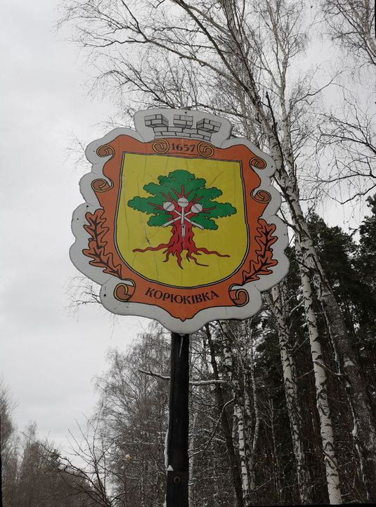 Korjukiwka -> begrüßt uns mit seinem Wappenschild noch im Wald, bevor nach und nach Häuser am Straßenrand erscheinen.