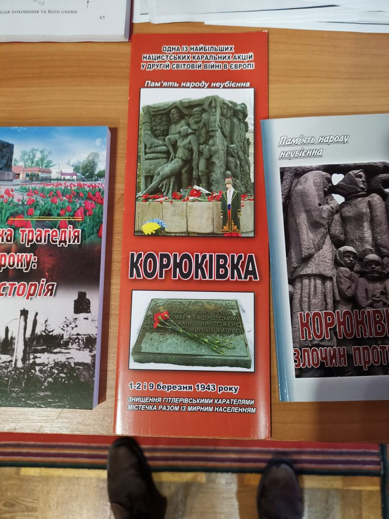 Das Historische Museum Korjukiwka stellt nicht nur die regionale Geschichte allgemein da, sondern dokumentiert und erläutert insbesondere das „Korjukiwka-Massaker“ der deutschen Wehrmacht und ungarischer Hilfstruppen Anfang März 1943. Kateryna : "Dieses Verbrechen wird in der deutschen Öffentlichkeit noch nicht ausreichend wahrgenommen, es liegen nur wenige Publikationen in deutscher Sprache vor. Derzeit steht das Thema noch im Fokus vor allem osteuropäischer Forscher und Experten, was auf ein erhebliches Informationsvakuum hinweist." Diese Anscht wird von maßgeblichen Osteuropa-Historikern geteilt.