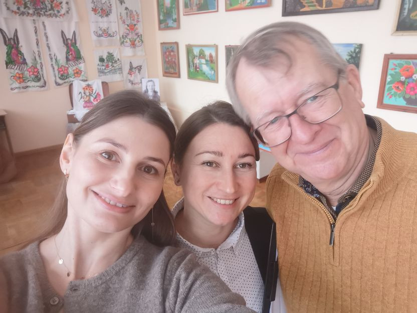 Mit Volodymyr große Aprikosen-Croissants zum Frühstück, konzentriertes Arbeiten für einen Video-Dreh im Historischen Museum Korjukiwka mit Kateryna und Alina, Abendessen bei Kateryna und Volodymyr.