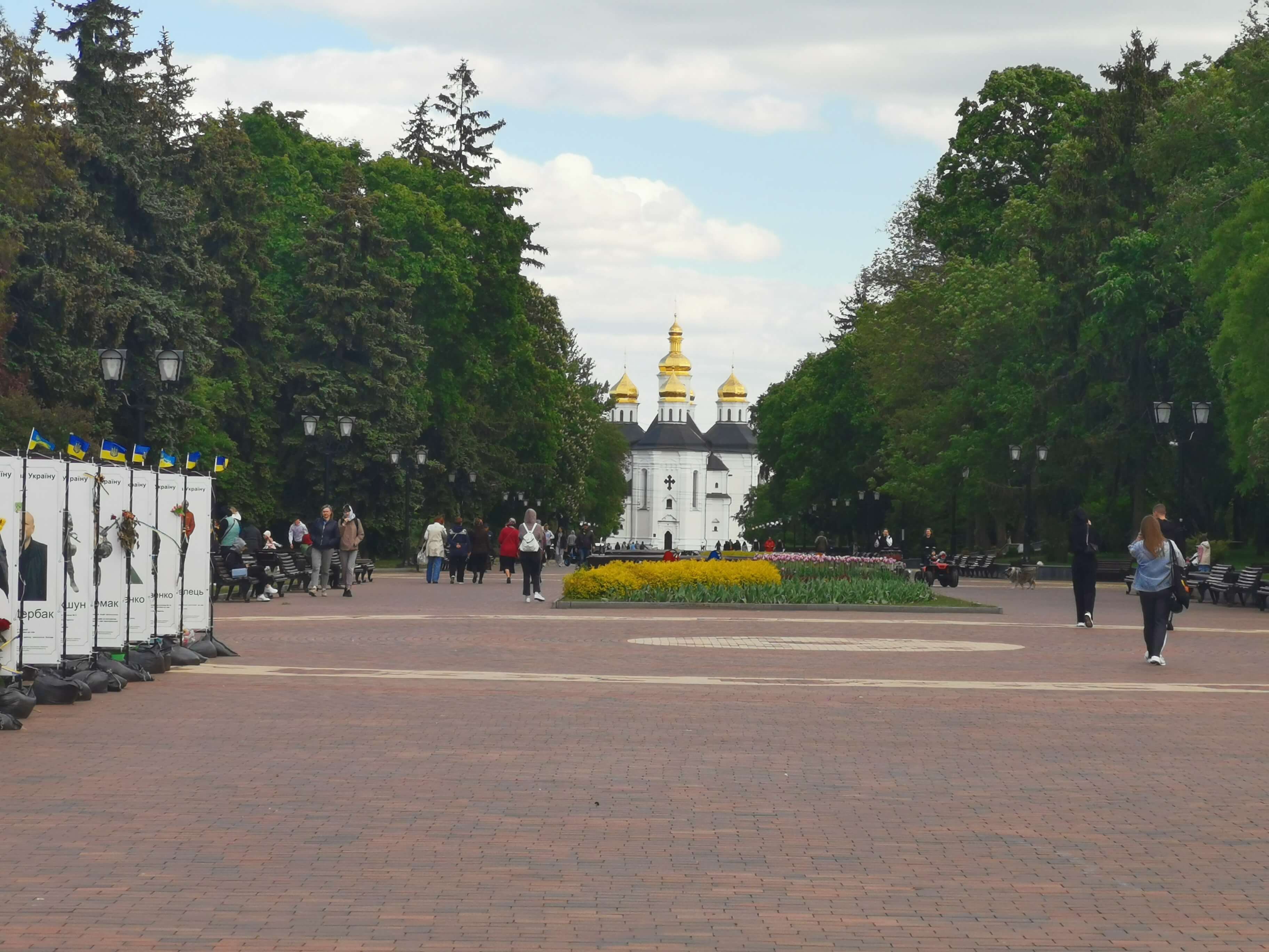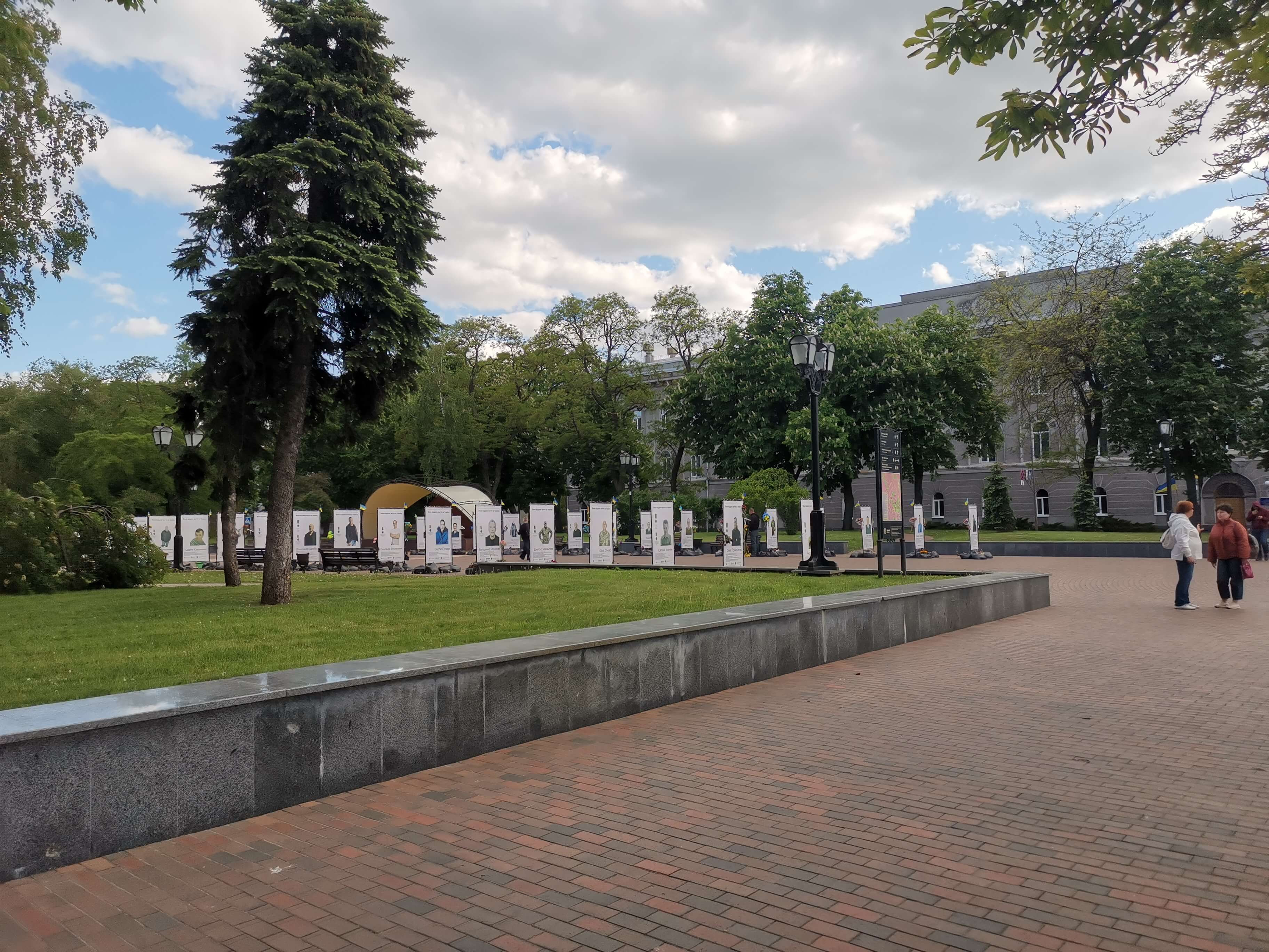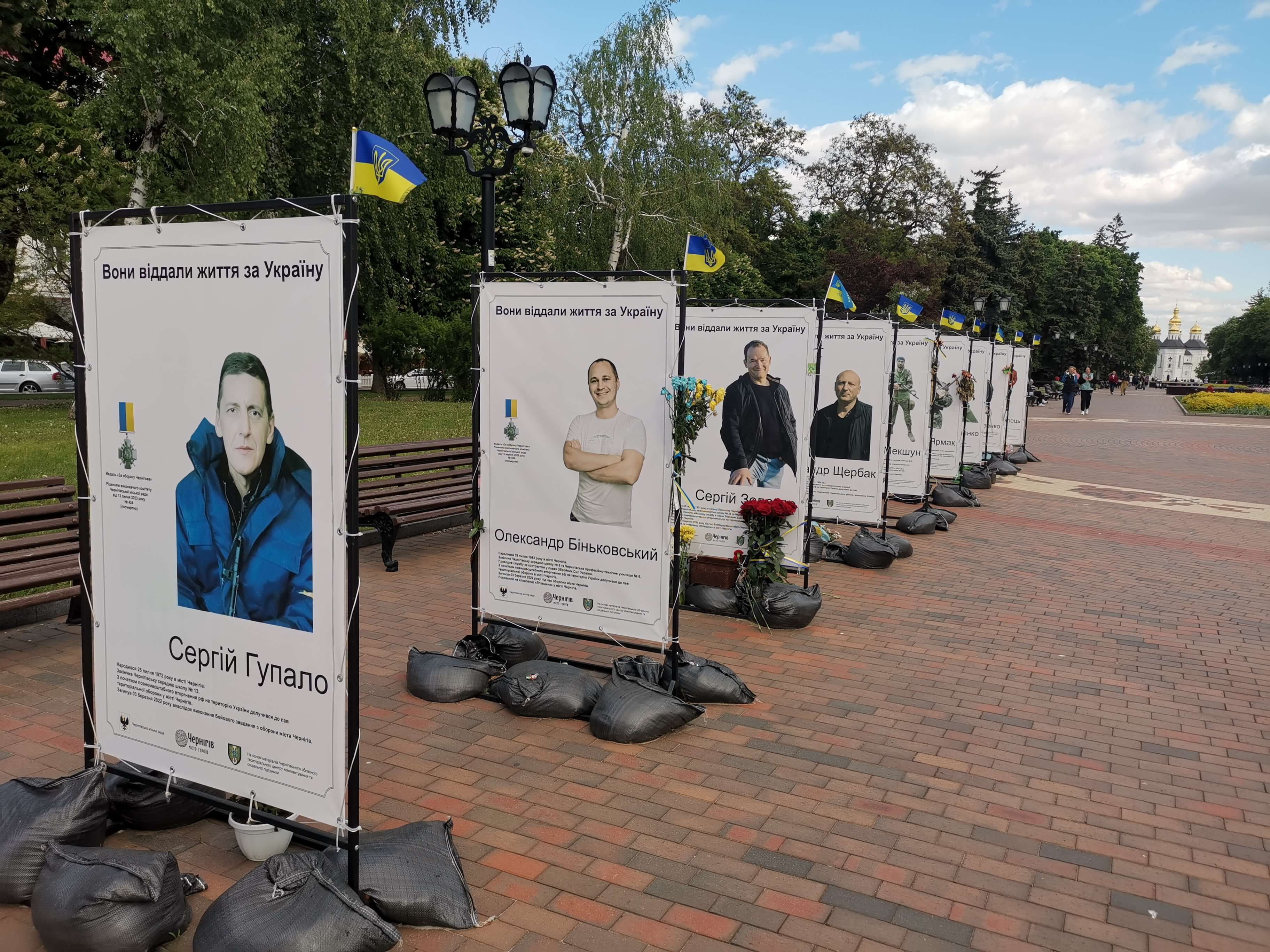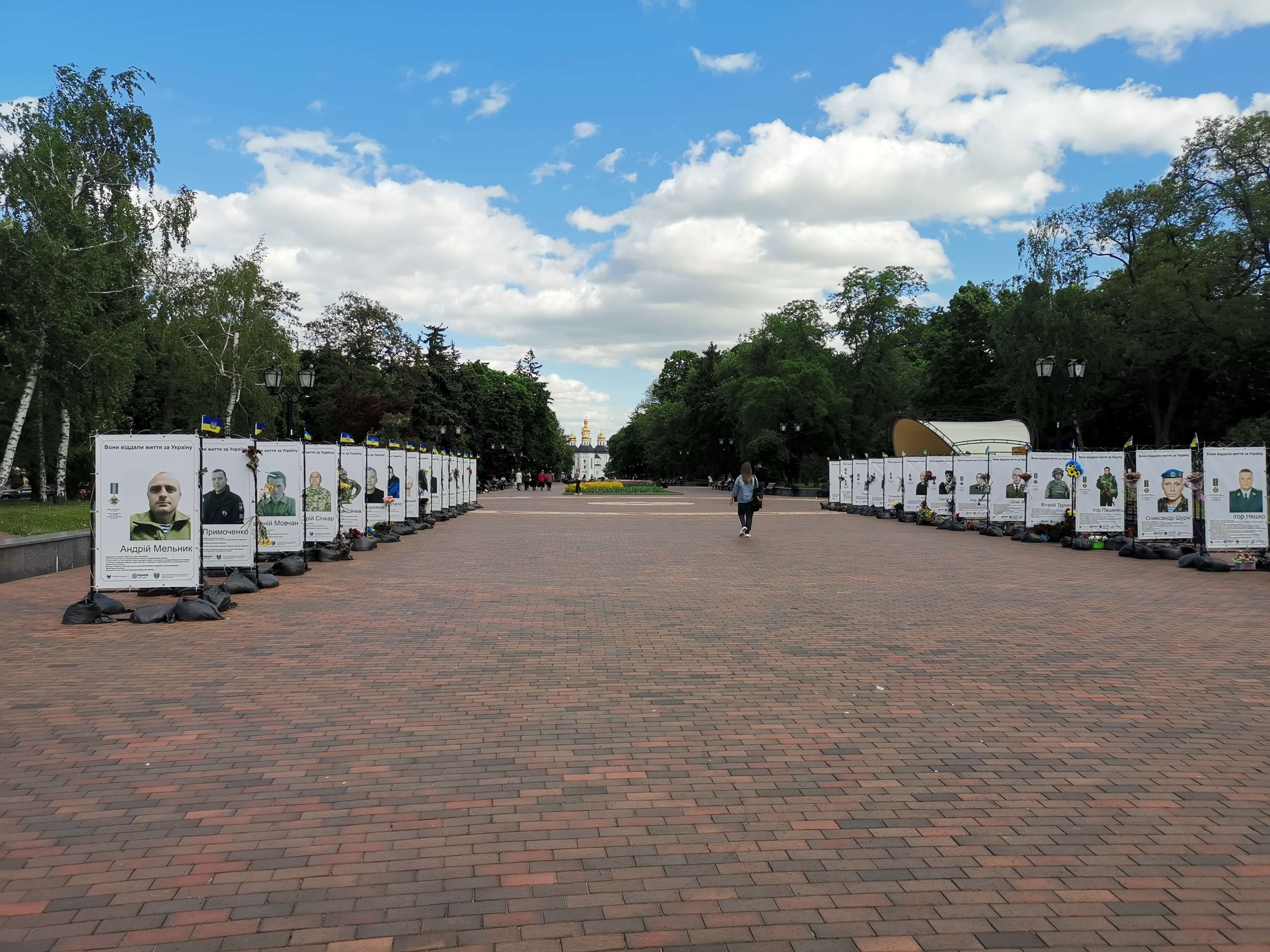 Vorbei an einer Ausstellung mit gestorbenen Soldaten aus Tschernihiw, Helden der Ukraine.