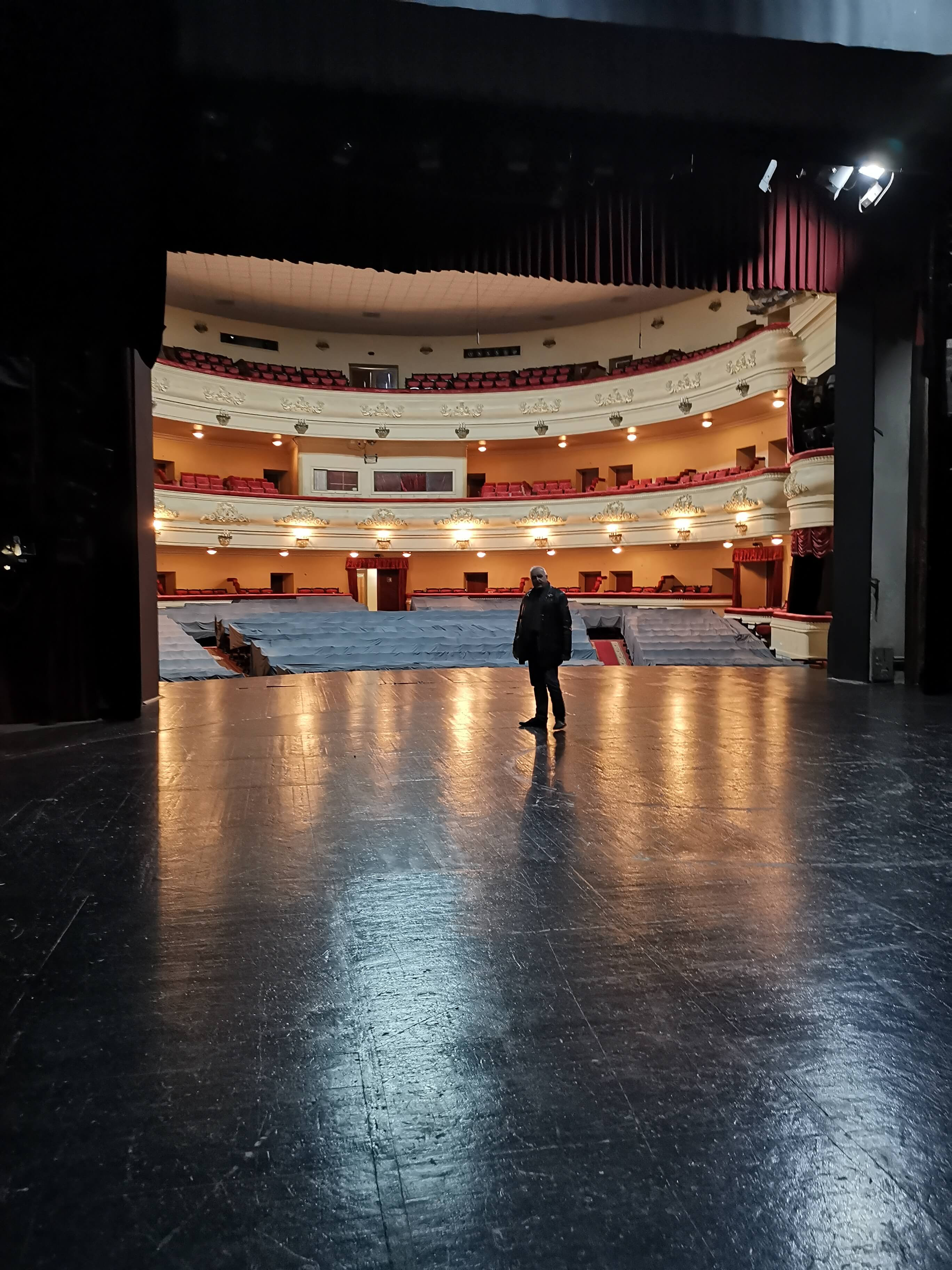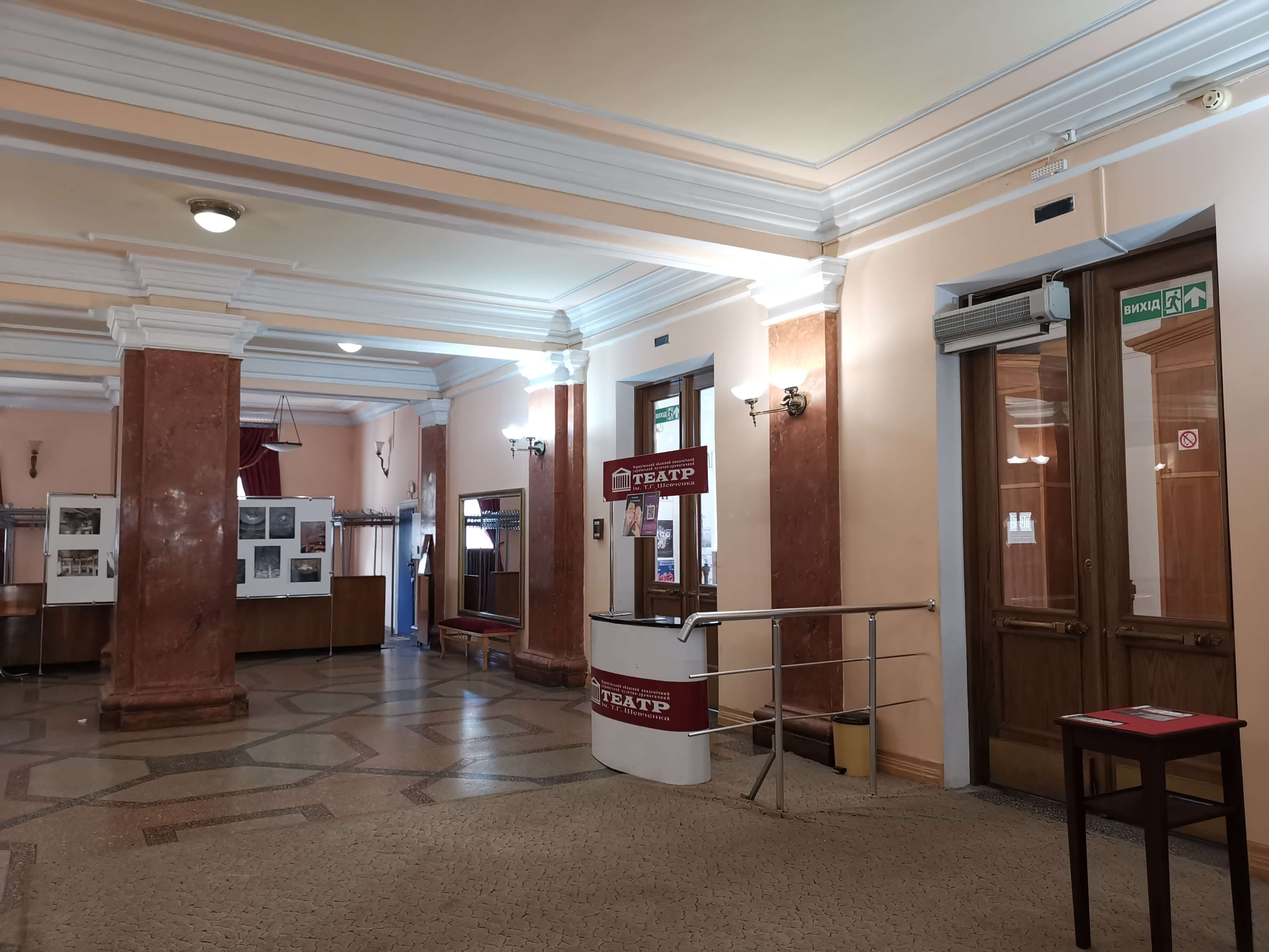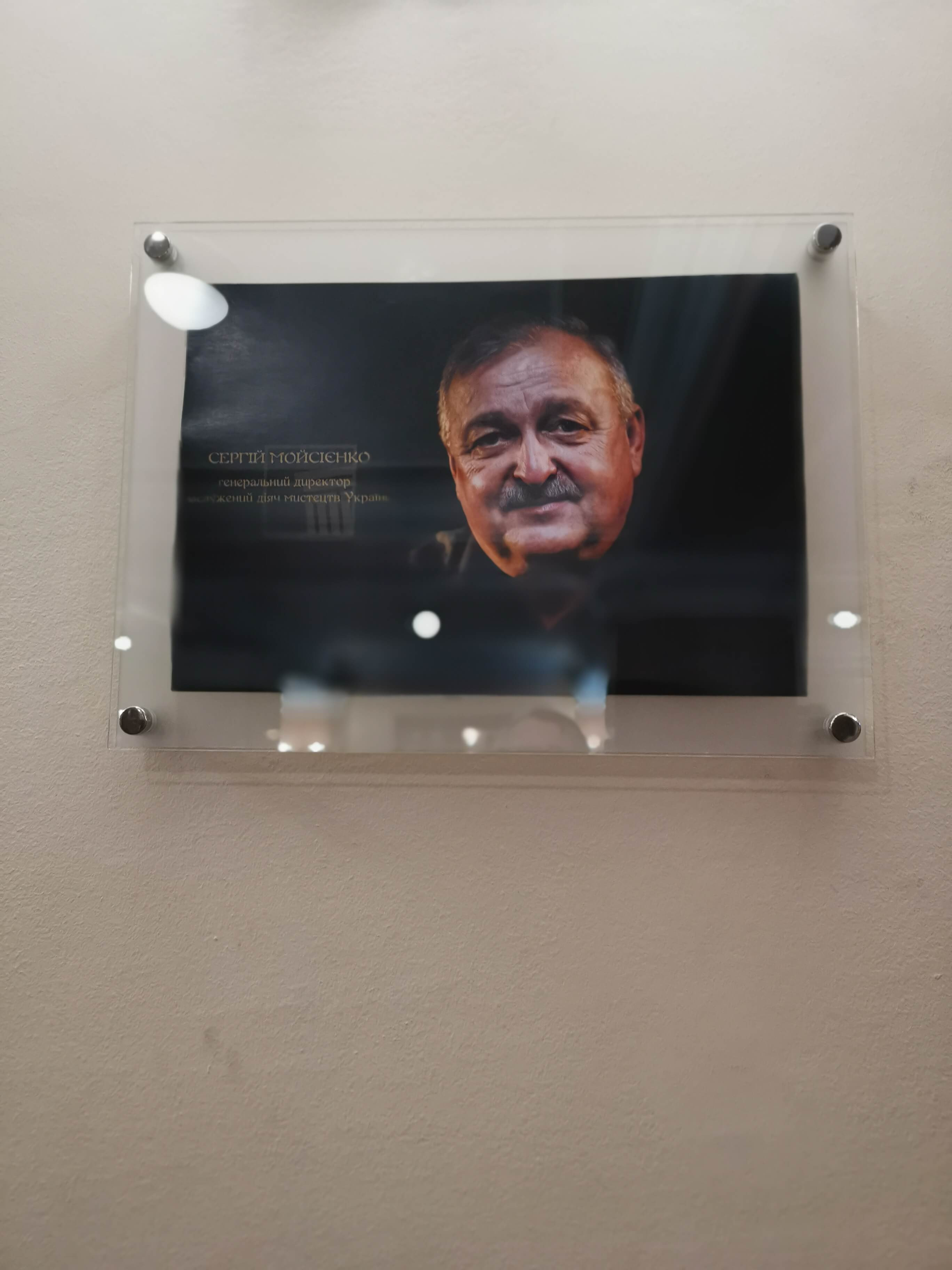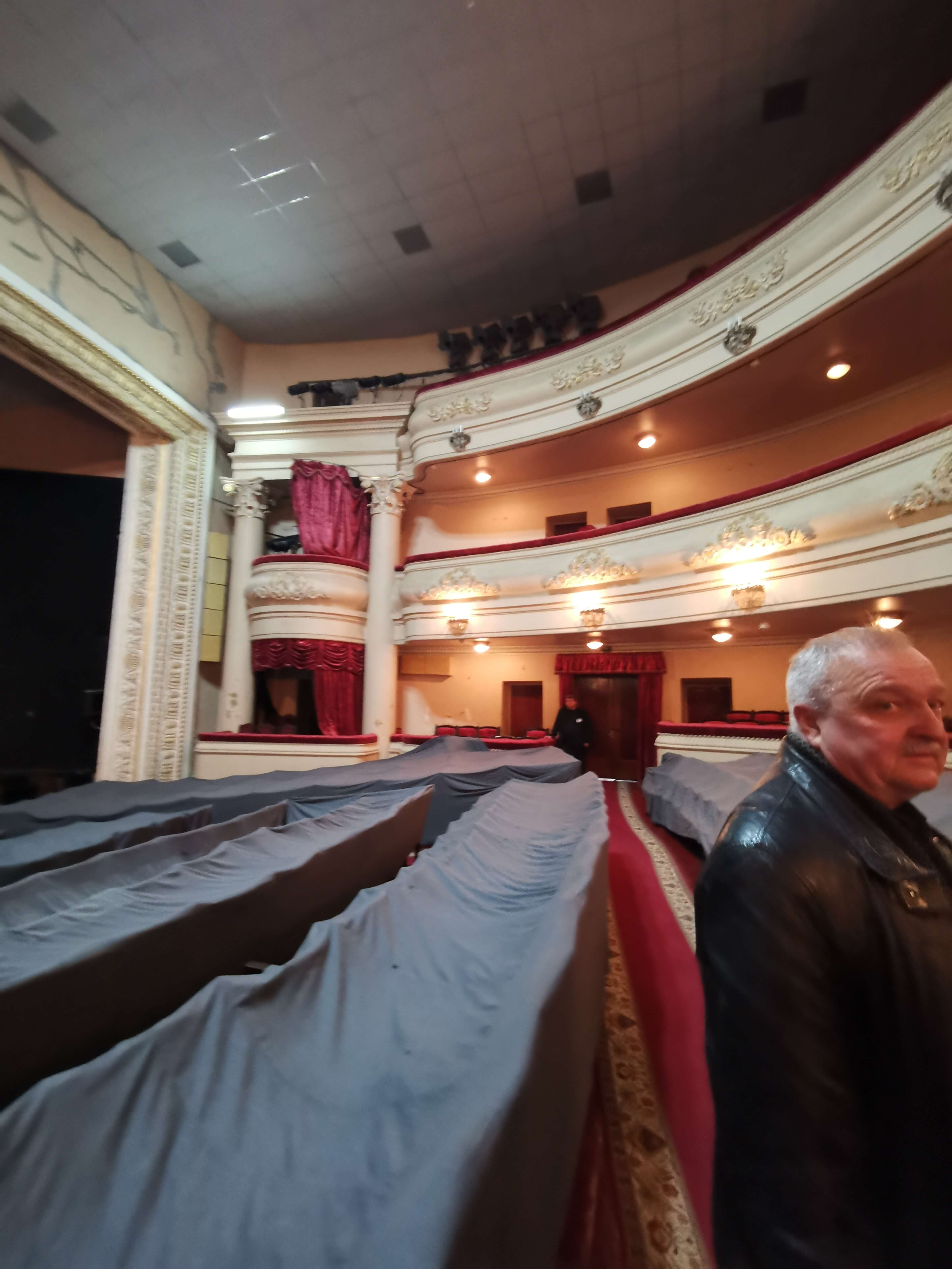 Lesya hat die Türen des Schevtschenko-Theater Tschernihiw für uns geöffnet (Akademisches Ukrainisches Regionales Musik- und Schauspieltheater Tschernihiw, benannt nach Taras Schewtschenko, dem bedeutendsten ukrainischen Lyriker schlechthin, der stark zur Entwicklung der modernen ukrainischen Sprache und zum Erwachen des ukrainischen Nationalbewusstseins beitrug ), wo wir am Eingang von Direktor Serhii Moisienko empfangen werden. Sehr eindrucksvoller Rundgang, ich darf alles fotografieren. Nach dem Bombeneinschlag am 19. 8. 2023 auf das Zentrum der Stadt, der das Theater schwer getroffen hat, war der Spielbetrieb nur kurz unterbrochen. Mit unglaublicher Improvisationskunst wurde weitergemacht. Es gibt viele Fotos zu den Schäden an den Wänden und Bilder von im Krieg umgekommenen Schauspieler und Schauspielerinnen, die teils als Soldaten gekämpft haben. Kurz vor unserem Besuch ist ein wichtiger Schauspieler als Soldat gefallen. Sein Portrait hängt bereits an der Wand. Radio Tschernihiw ("Öffentliches Tschernihiw" https://suspilne.media/chernihiv/ ) hat dazu eine Dokumentation veröffentlicht.