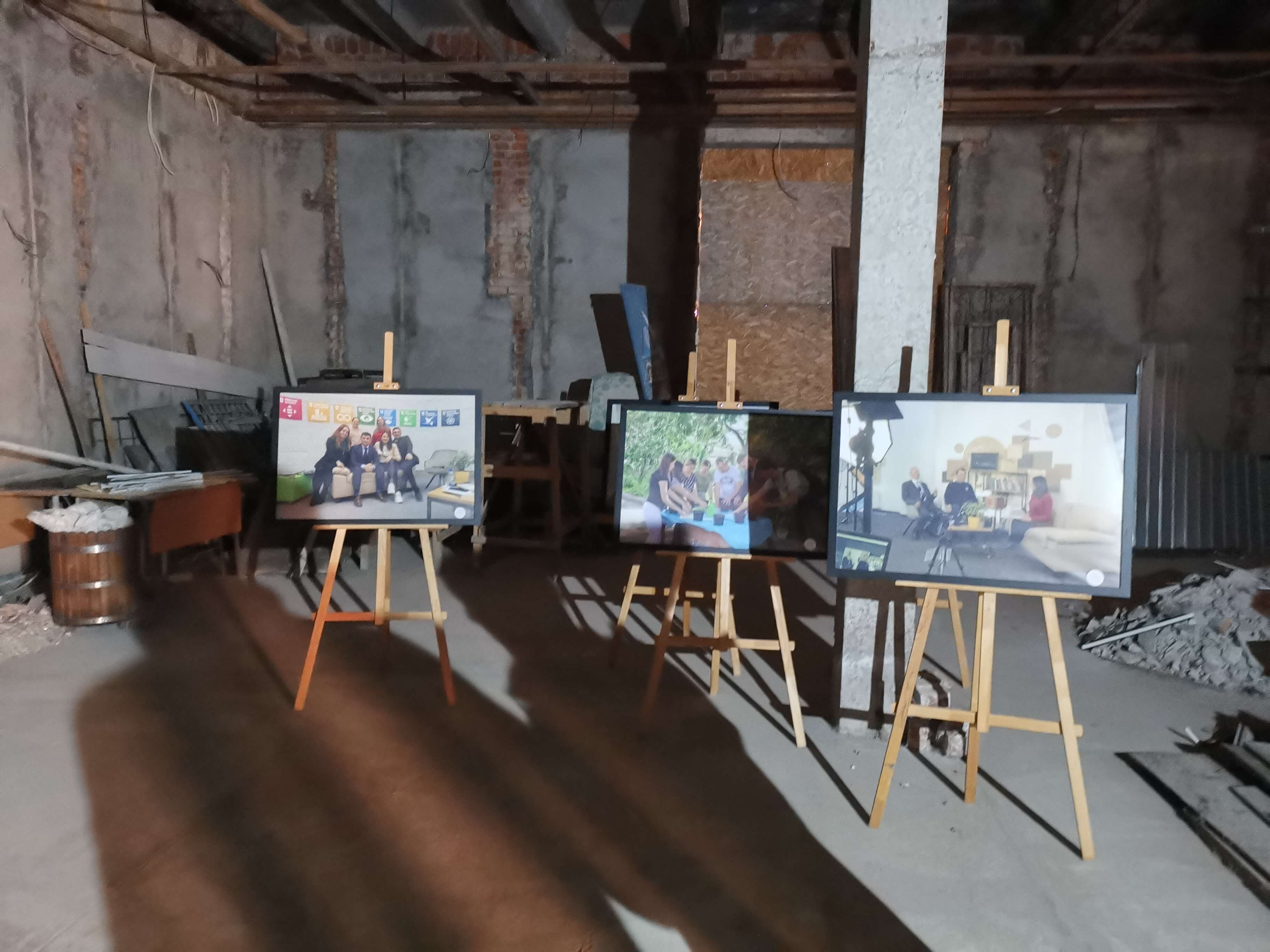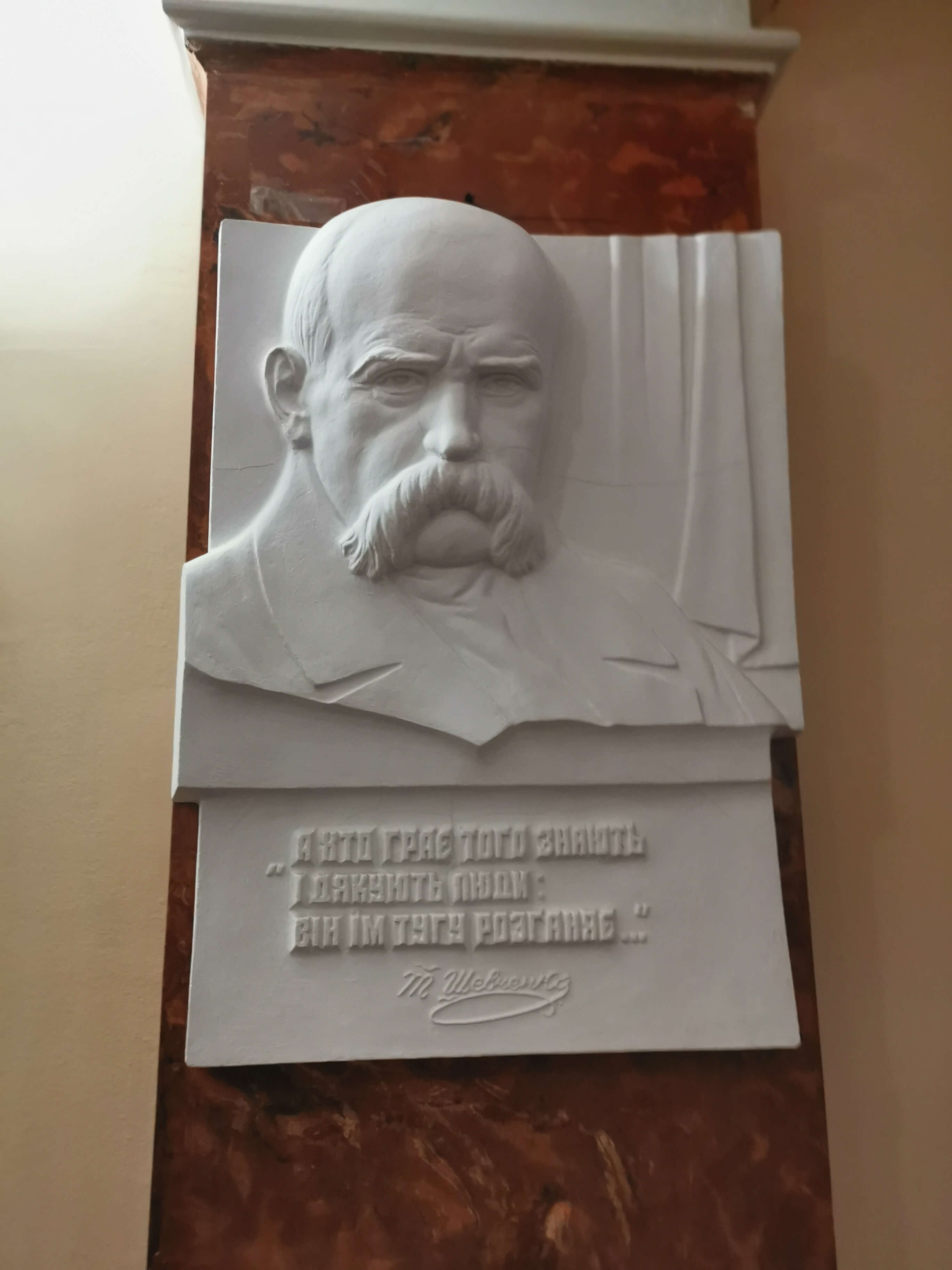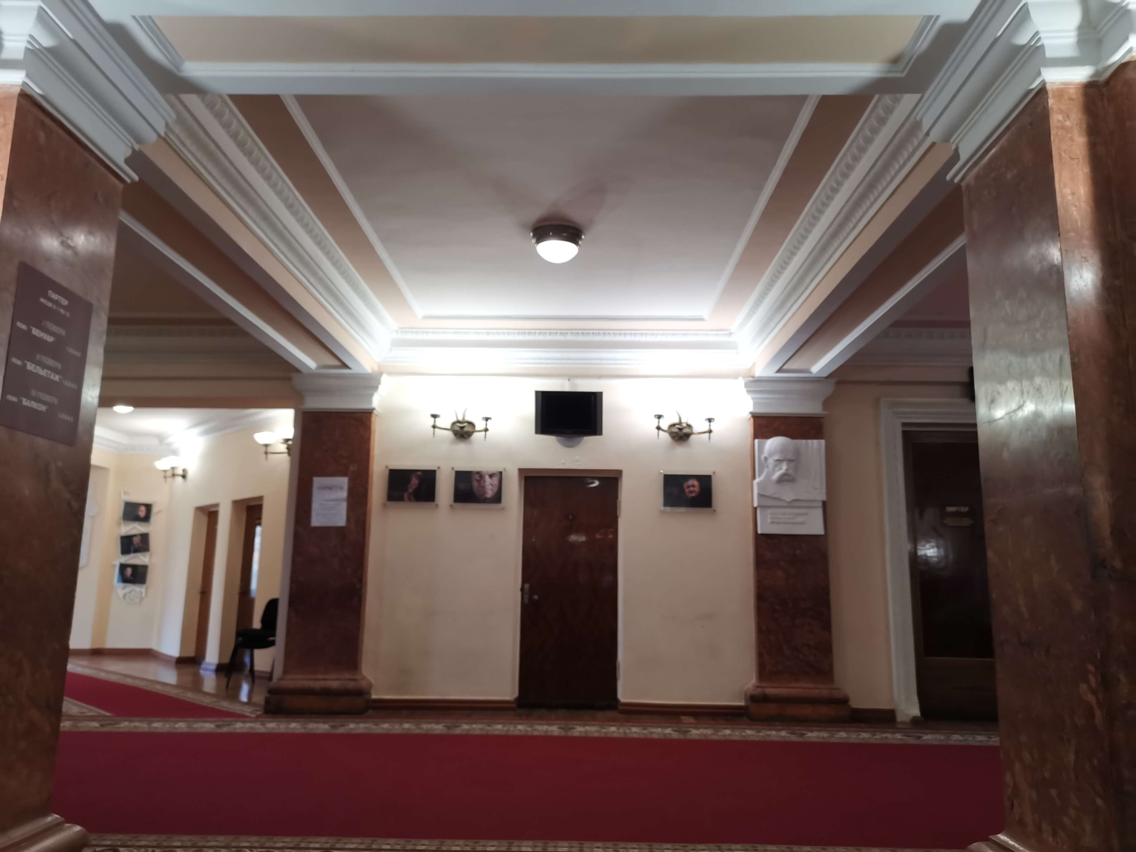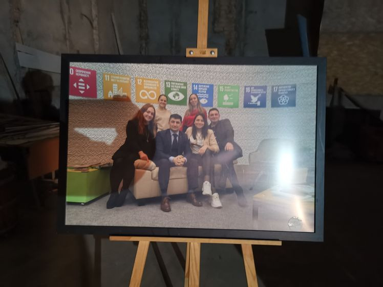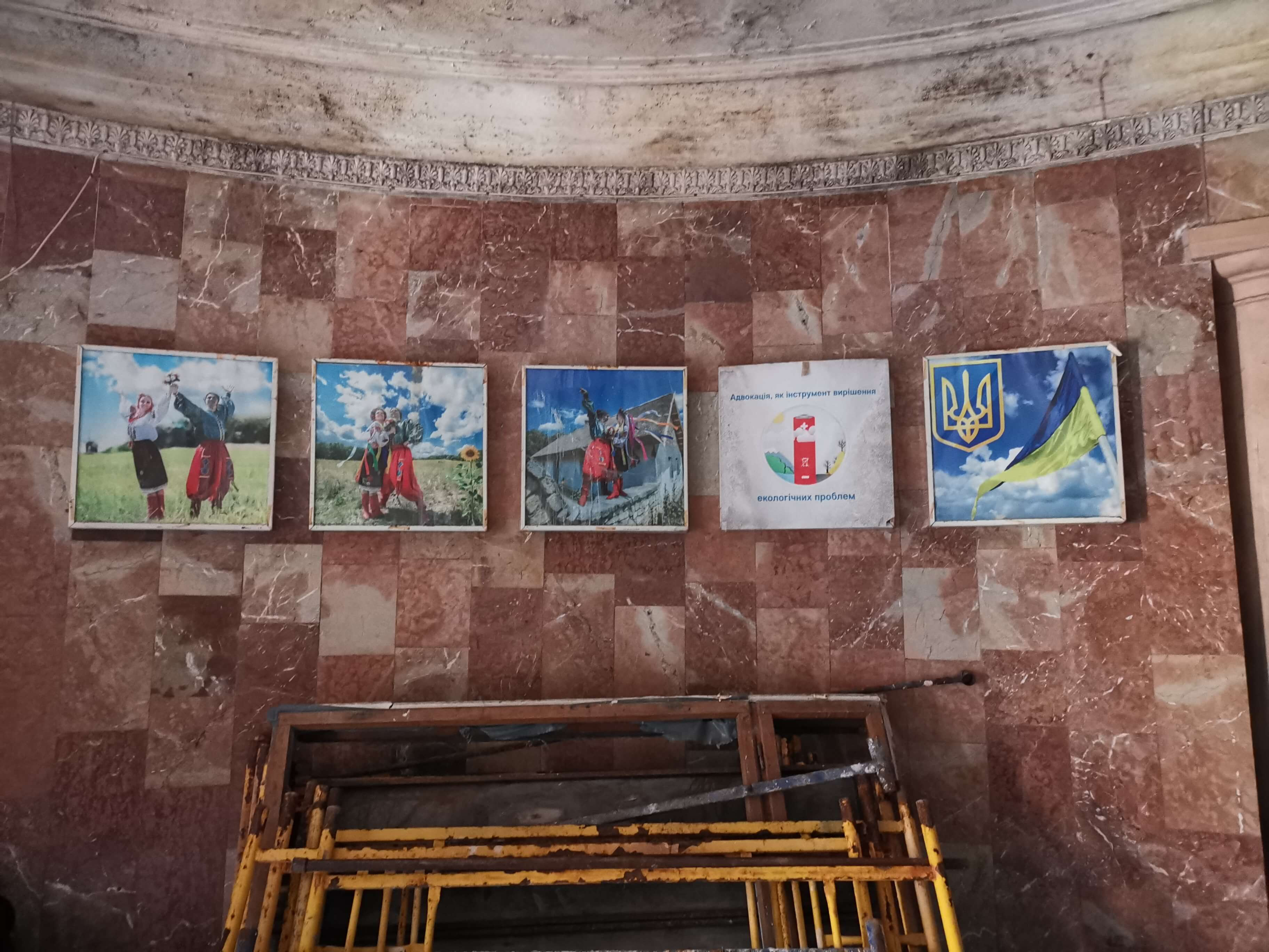 Lesya hat die Türen des Schevtschenko-Theater Tschernihiw für uns geöffnet (Akademisches Ukrainisches Regionales Musik- und Schauspieltheater Tschernihiw, benannt nach Taras Schewtschenko, dem bedeutendsten ukrainischen Lyriker schlechthin, der stark zur Entwicklung der modernen ukrainischen Sprache und zum Erwachen des ukrainischen Nationalbewusstseins beitrug ), wo wir am Eingang von Direktor Serhii Moisienko empfangen werden. Sehr eindrucksvoller Rundgang, ich darf alles fotografieren. Nach dem Bombeneinschlag am 19. 8. 2023 auf das Zentrum der Stadt, der das Theater schwer getroffen hat, war der Spielbetrieb nur kurz unterbrochen. Mit unglaublicher Improvisationskunst wurde weitergemacht. Es gibt viele Fotos zu den Schäden an den Wänden und Bilder von im Krieg umgekommenen Schauspieler und Schauspielerinnen, die teils als Soldaten gekämpft haben. Kurz vor unserem Besuch ist ein wichtiger Schauspieler als Soldat gefallen. Sein Portrait hängt bereits an der Wand. Radio Tschernihiw ("Öffentliches Tschernihiw" https://suspilne.media/chernihiv/ ) hat dazu eine Dokumentation veröffentlicht.