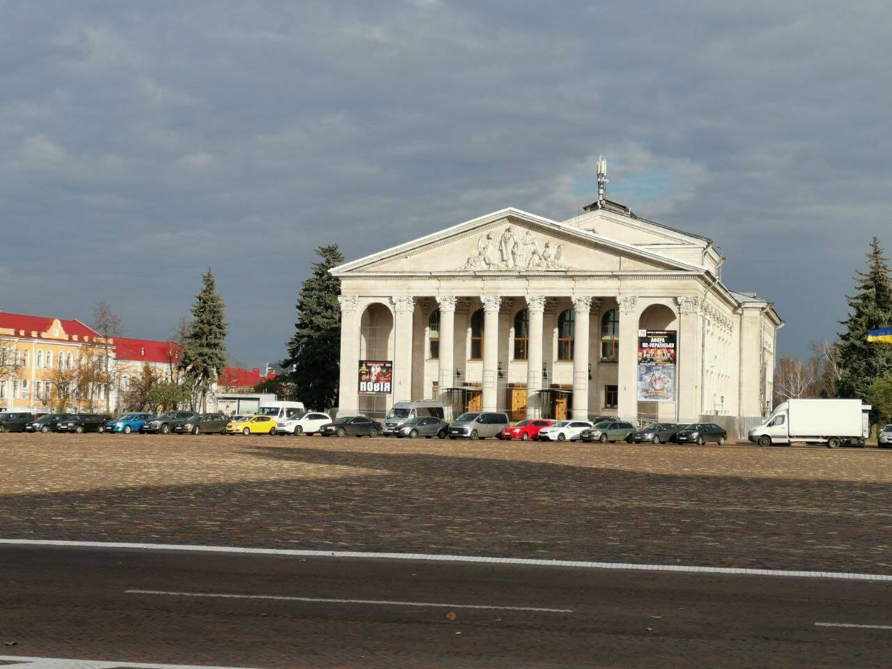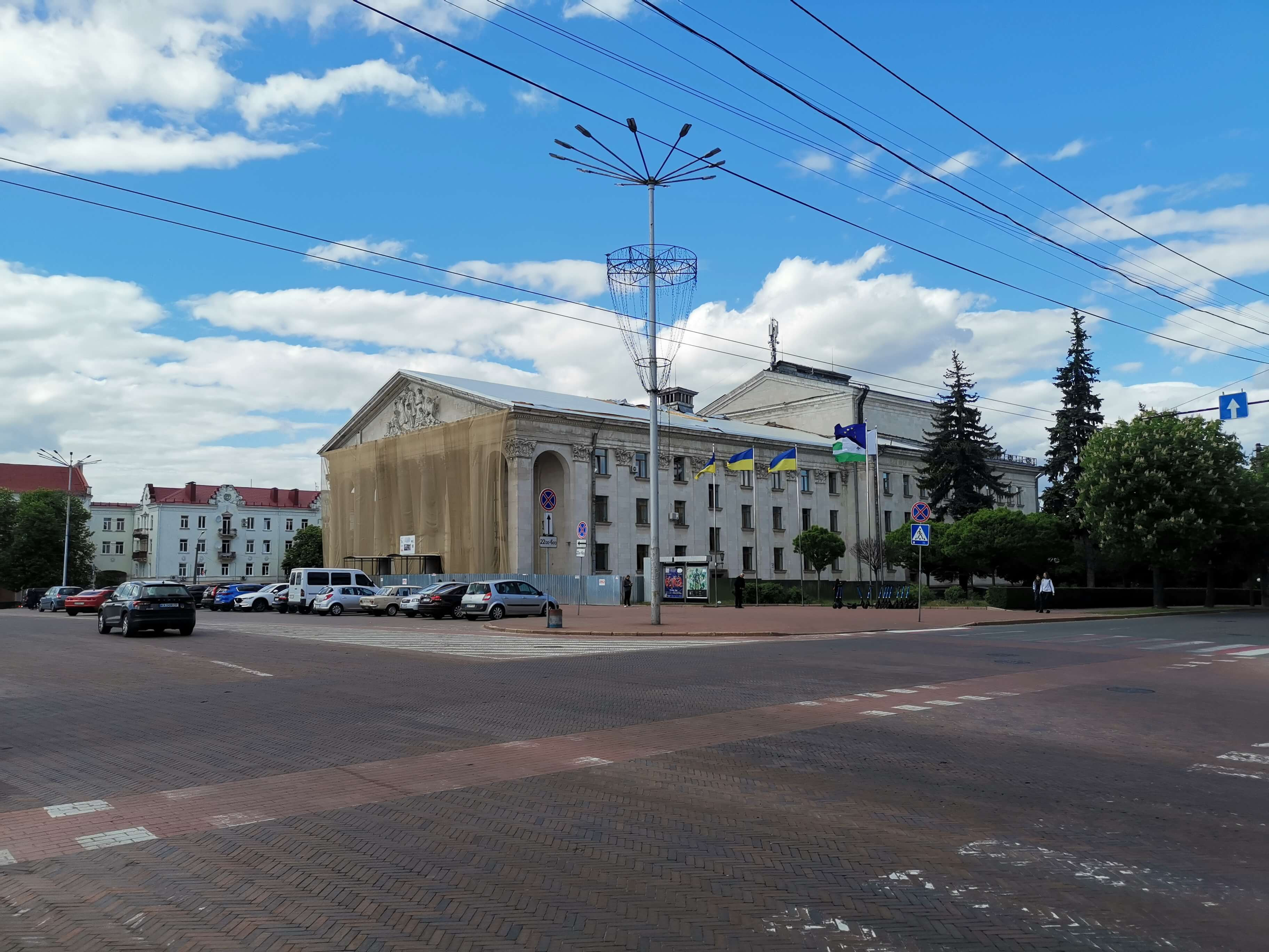 Rundgang am Krasna-Sqaure, zerstörtes Jugendzentrum, Schevtchenko-Theater, Pjatniza-Kirche und am Abend das Treffen mit Olena, Volodymyr und Vladyslav.