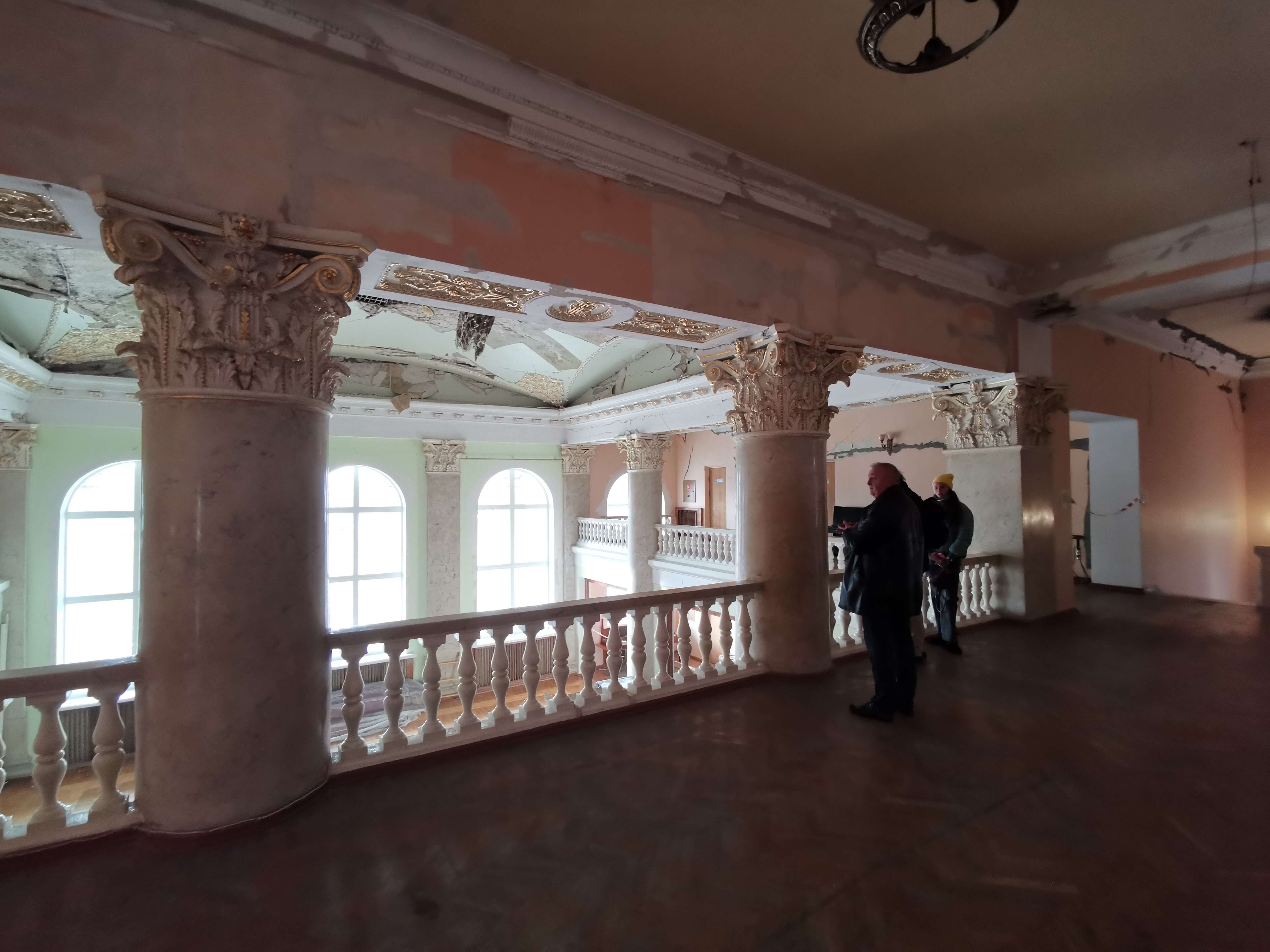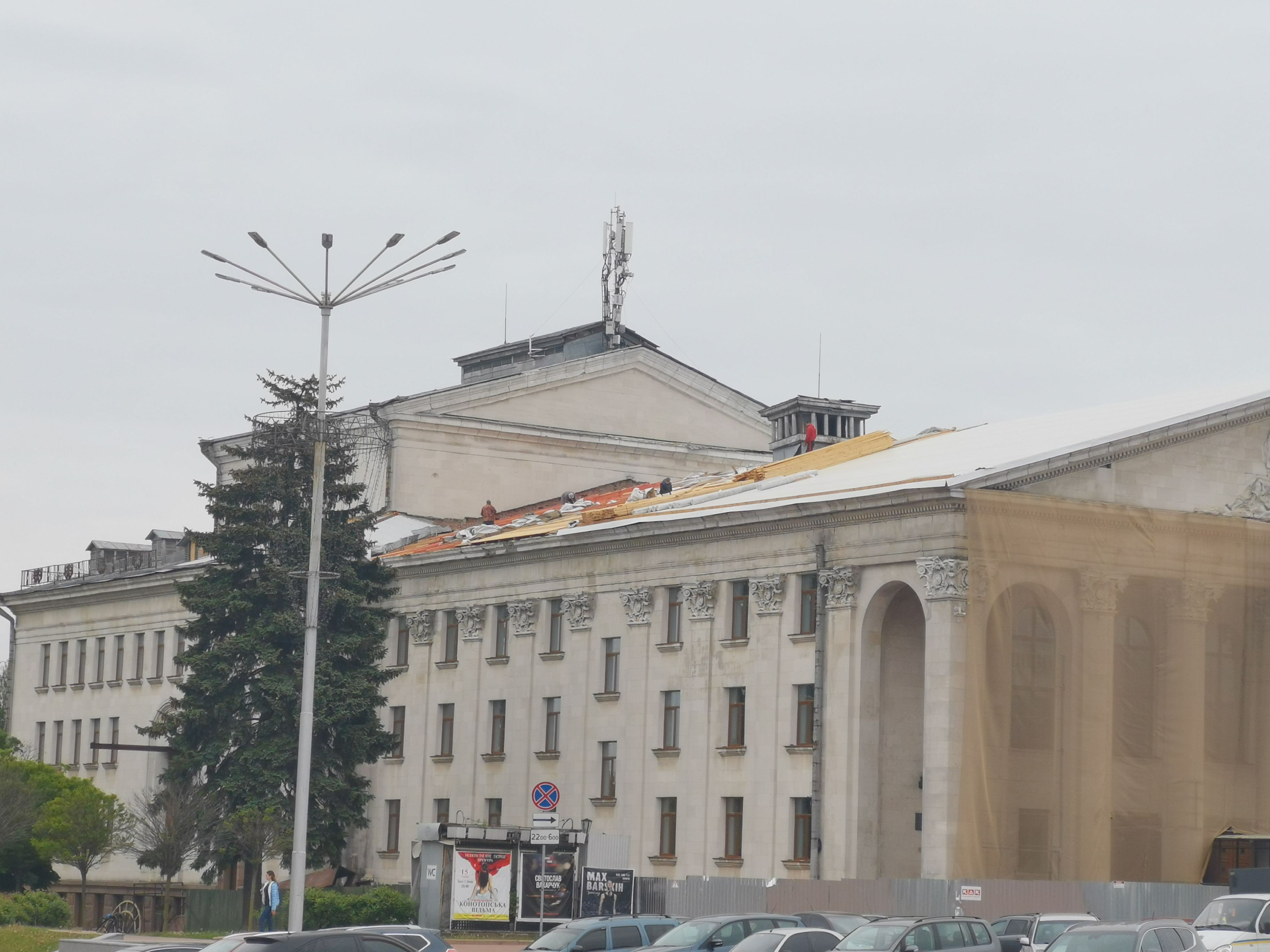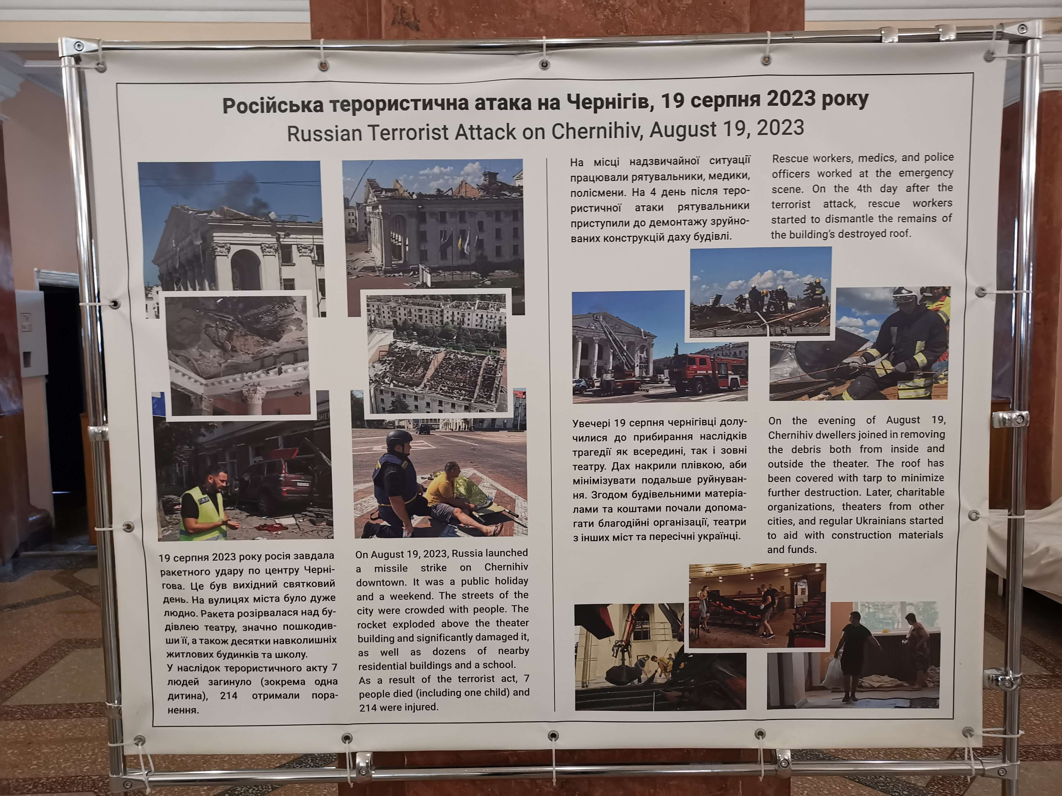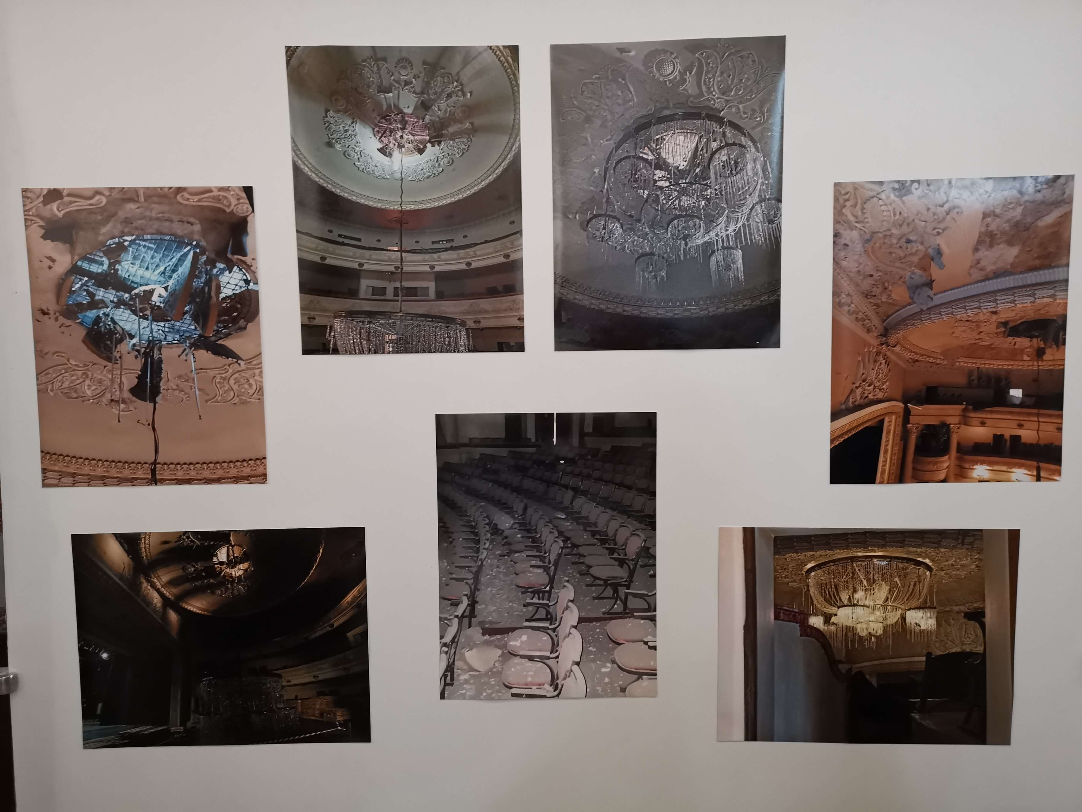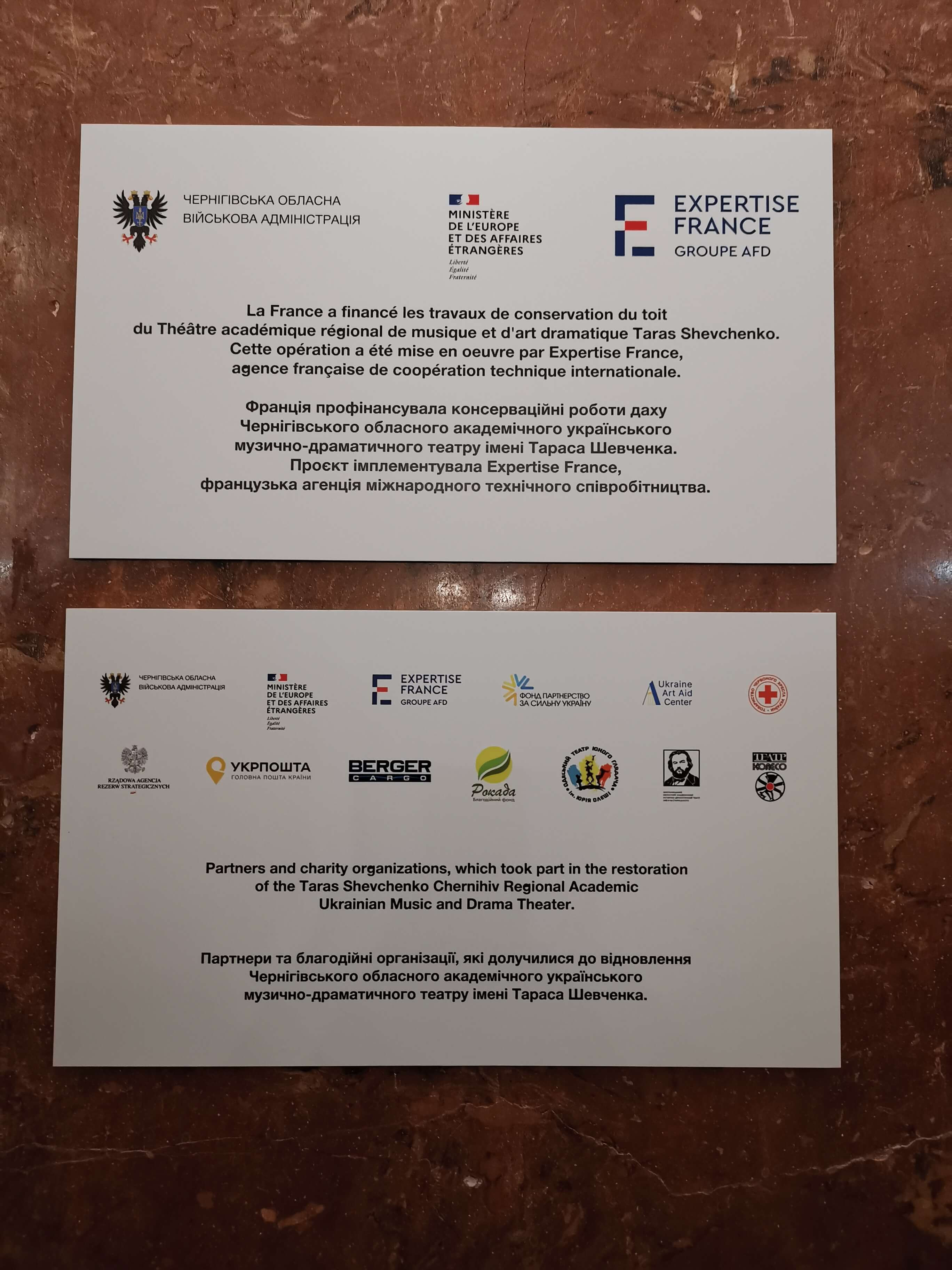 Die materiellen Schäden werden gezeigt, natürlich ist die vollständige Wiederherstellung vom Theater und der Stadt Tschernihiw nicht finanziell zu schaffen. Hilfe aus dem Ausland ist erforderlich und erste Hilfe gibt es auch schon. Eine Tafel zeigt, dass Frankreich, welches sich in der Region Tschernihiw erheblich engagiert, schon geholfen hat. Aber es hat bisher nur für das Allernötigste gereicht. Das Dach, an dem beim meinem vorherigen Besuch im Mai 2024 gearbeitete wurde, ist von außen fertig, jedenfalls ist von außen nichts anderes zu sehen. Innen ist noch so viel zu tun.