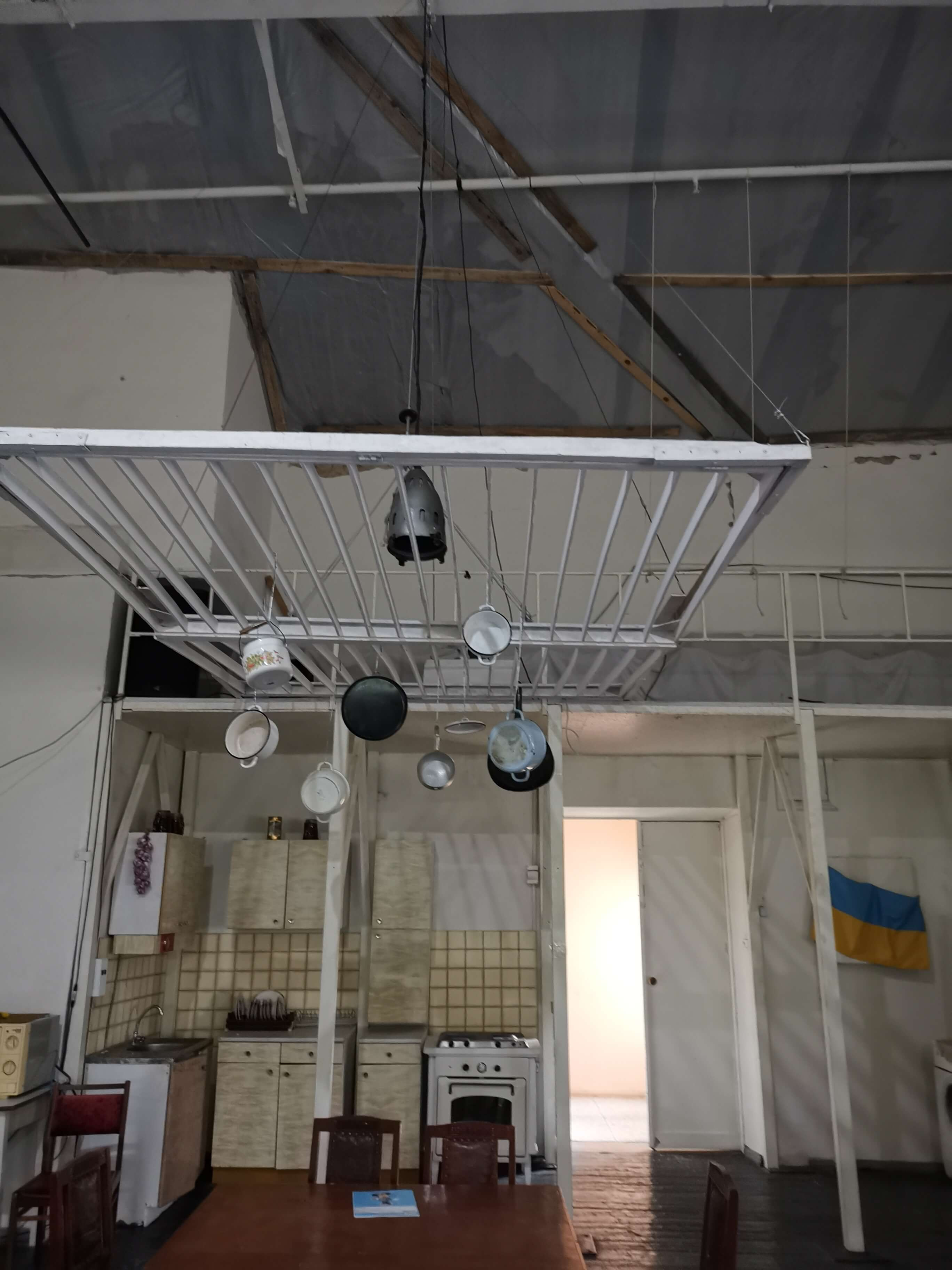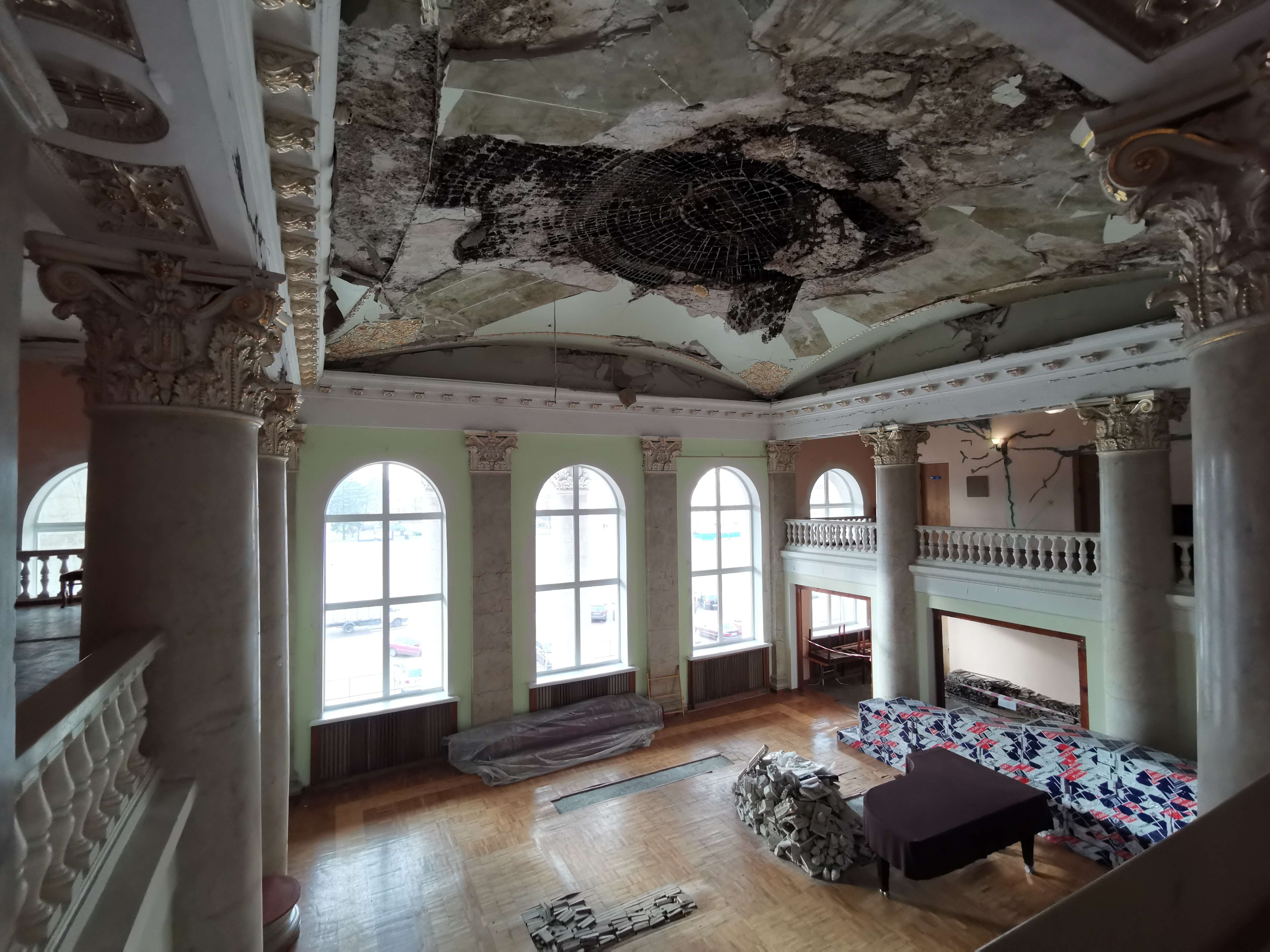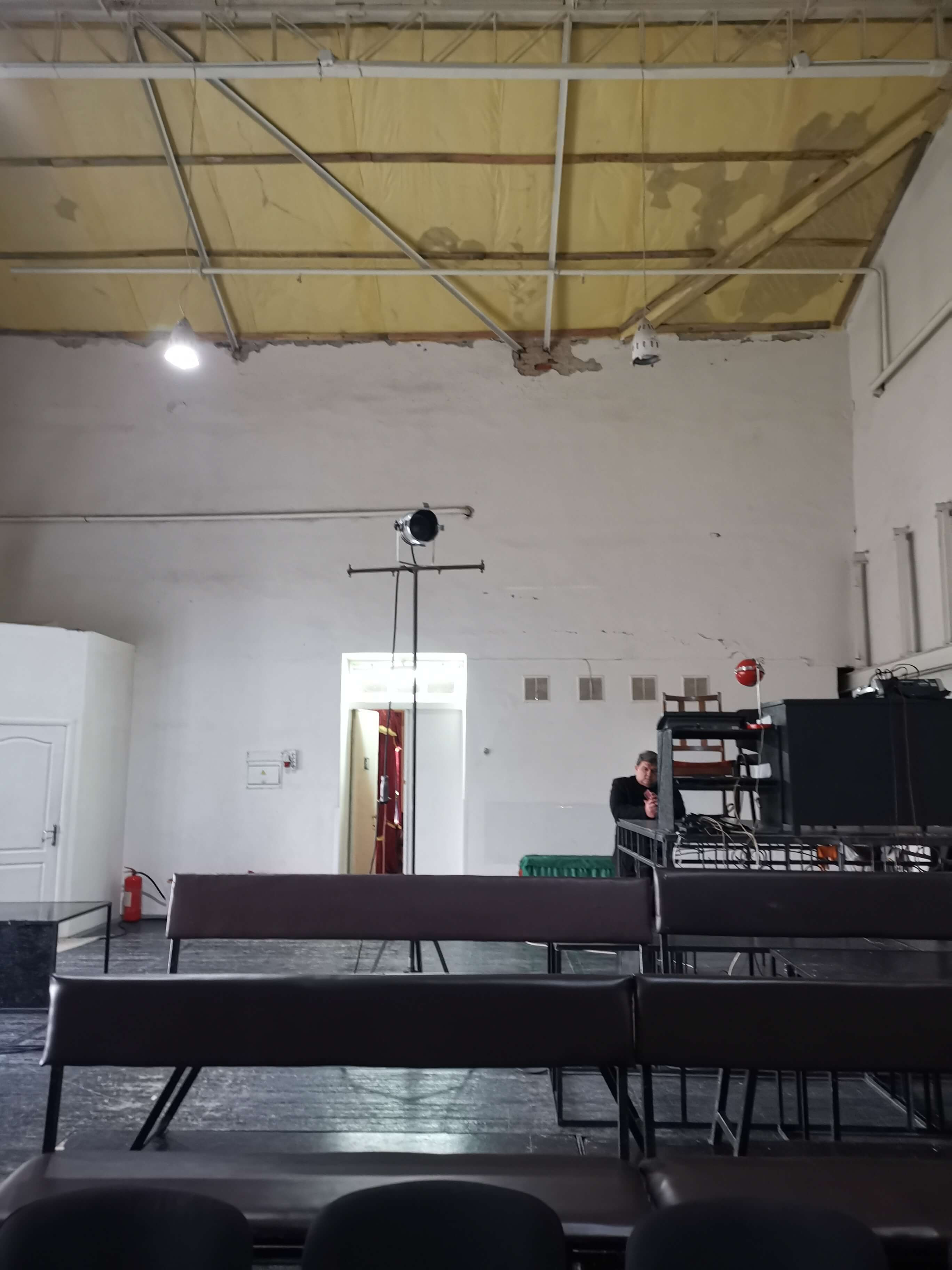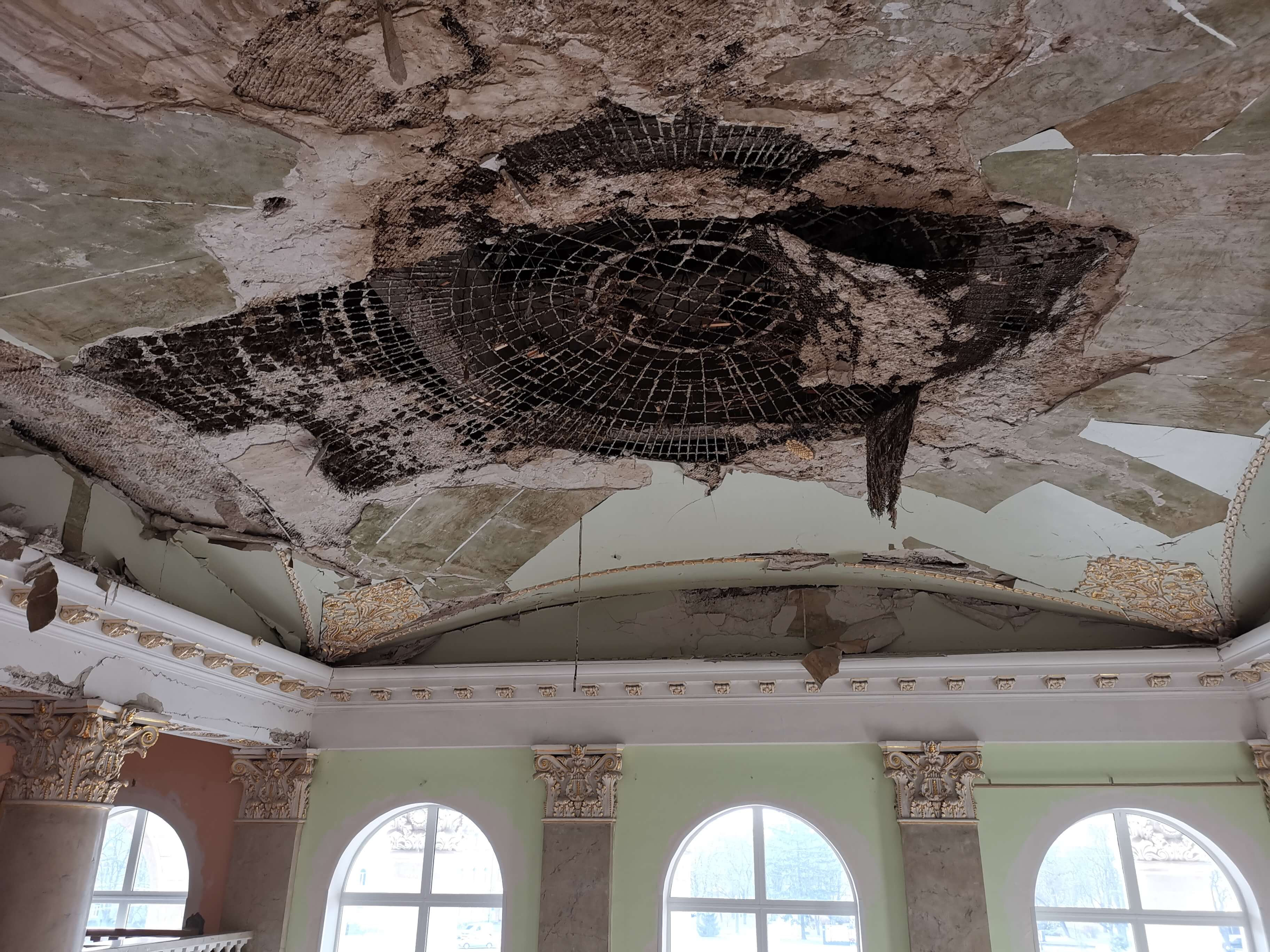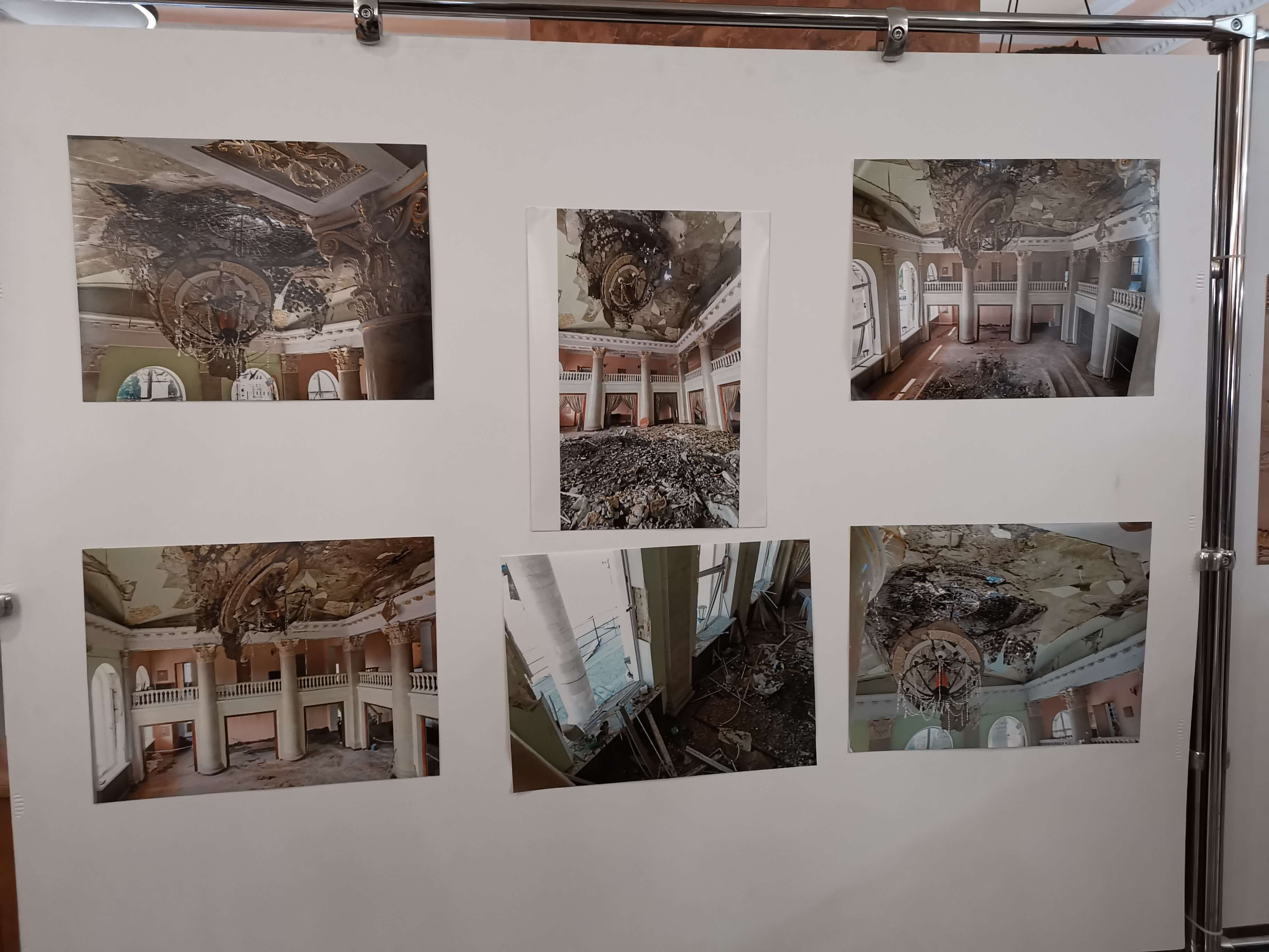 Die materiellen Schäden werden gezeigt, natürlich ist die vollständige Wiederherstellung vom Theater und der Stadt Tschernihiw nicht finanziell zu schaffen. Hilfe aus dem Ausland ist erforderlich und erste Hilfe gibt es auch schon. Eine Tafel zeigt, dass Frankreich, welches sich in der Region Tschernihiw erheblich engagiert, schon geholfen hat. Aber es hat bisher nur für das Allernötigste gereicht. Das Dach, an dem beim meinem vorherigen Besuch im Mai 2024 gearbeitete wurde, ist von außen fertig, jedenfalls ist von außen nichts anderes zu sehen. Innen ist noch so viel zu tun.