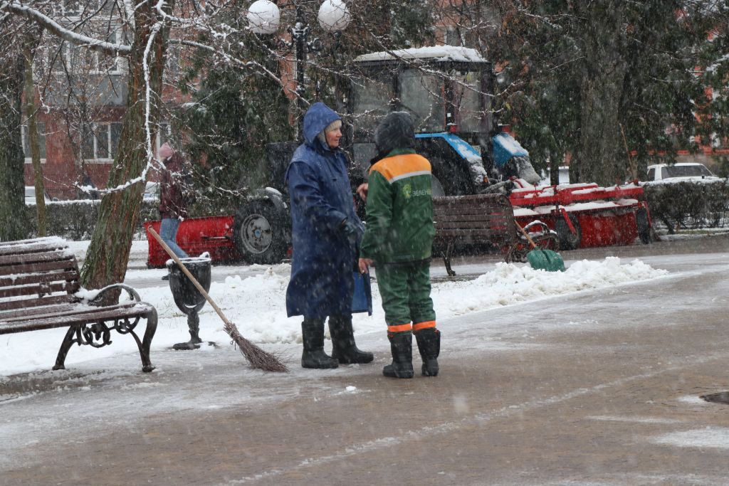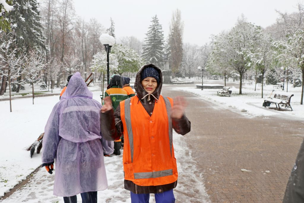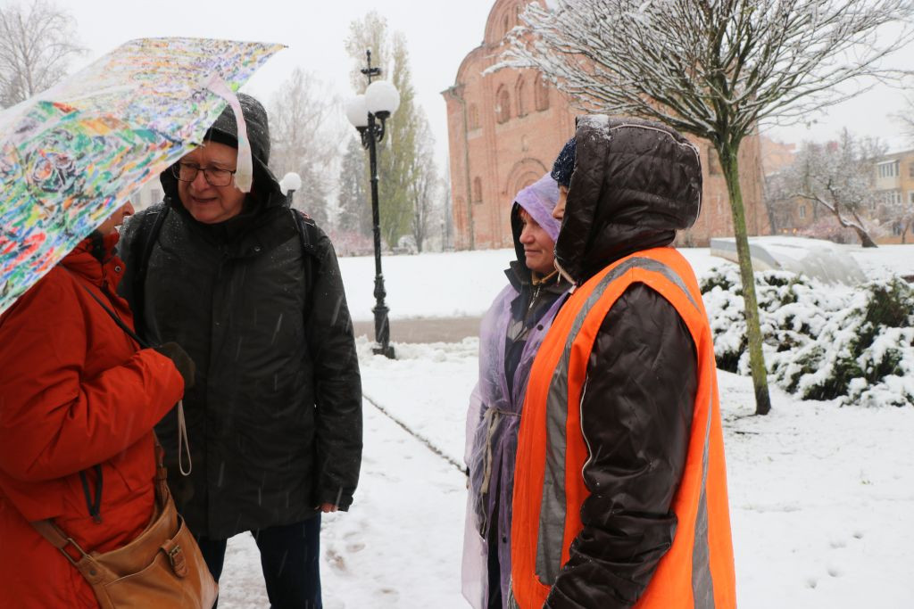 Also ziehen wir weiter in den Bohdan Khmelnytskyi Garden Park um die Pjatniza-Kirche. Dort steht eine Gruppe älterer Frauen dick eingepackt in Wattejacken und räumt mit Besen und Schneeschieber die Wege frei von Schneematsch und Eis.