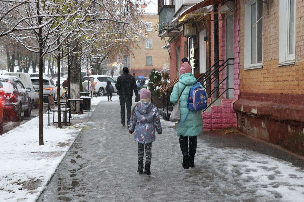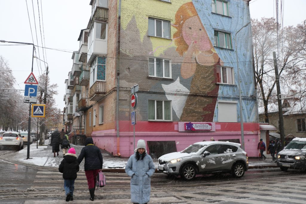 Aber wir ziehen los. Vladyslav packt trotz des Schnees seine gute Canon-Kamera aus und wir gehen vom Hotel in Richtung einer Schule. Vladyslav möchte vor der Schule Eltern ansprechen und versuchen, kurze Interviews zu erhalten.