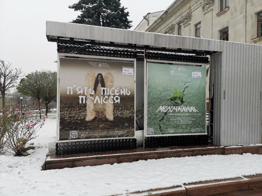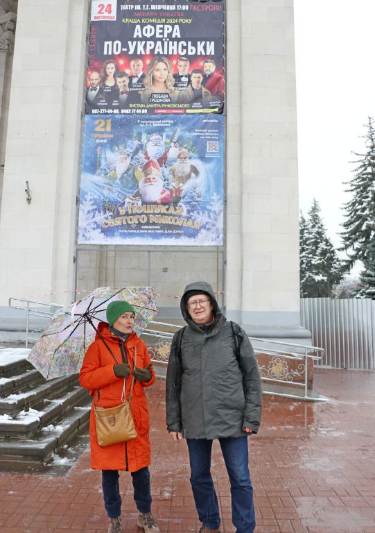 Ein paar Meter weiter trifft Vladyslav dann eine Bekannte, die im Theater arbeitet nur gut 100 Meter weiter. Vladyslav umgarnt sie ein wenig und in damenhafter Haltung gibt sie ein Interview, es kommt ein richtiges kleines Gespräch zustande. Vladyslavs Sorge um seine Kamera im Schneetreiben scheint irgendwie verschwunden. Er ist ganz in seinem Element...