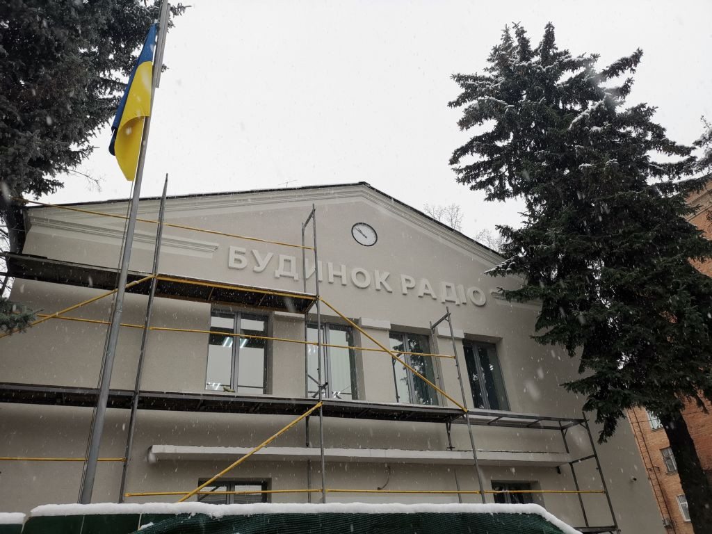 Zwischendurch hat Vladyslav telefoniert und wir steuern das Studio-Gebäude von Radio Tschernihiw ("Öffentliches Tschernihiw" https://suspilne.media/chernihiv/ ) an, ich kann es kaum glauben. Von außen frisch renoviert, ein Gerüst steht noch am Gebäude, sind wir in wenigen Schritten mitten drin in den Redaktions- und Studioräumen.