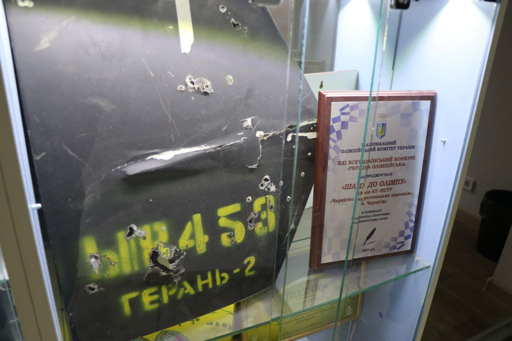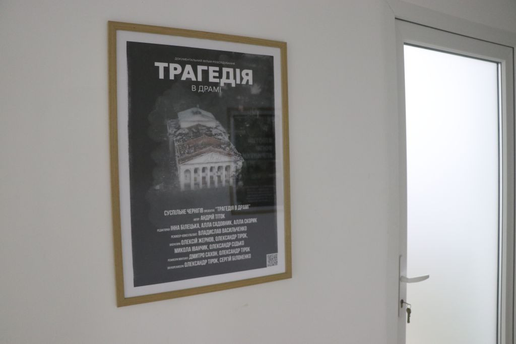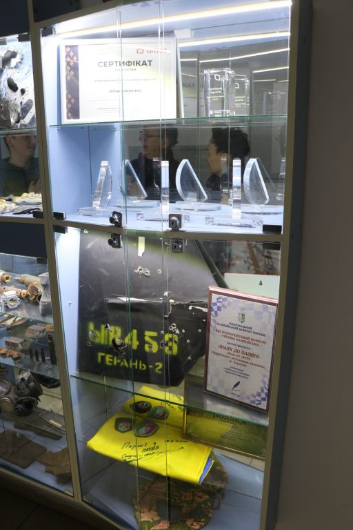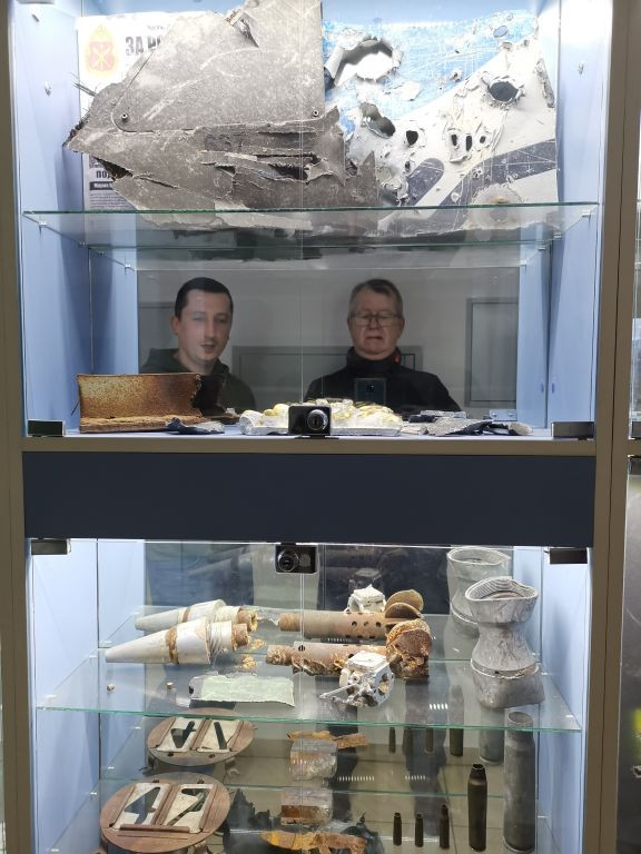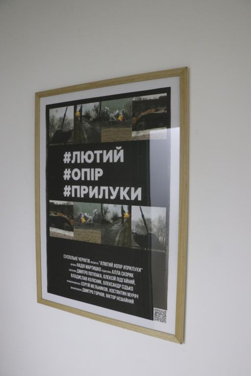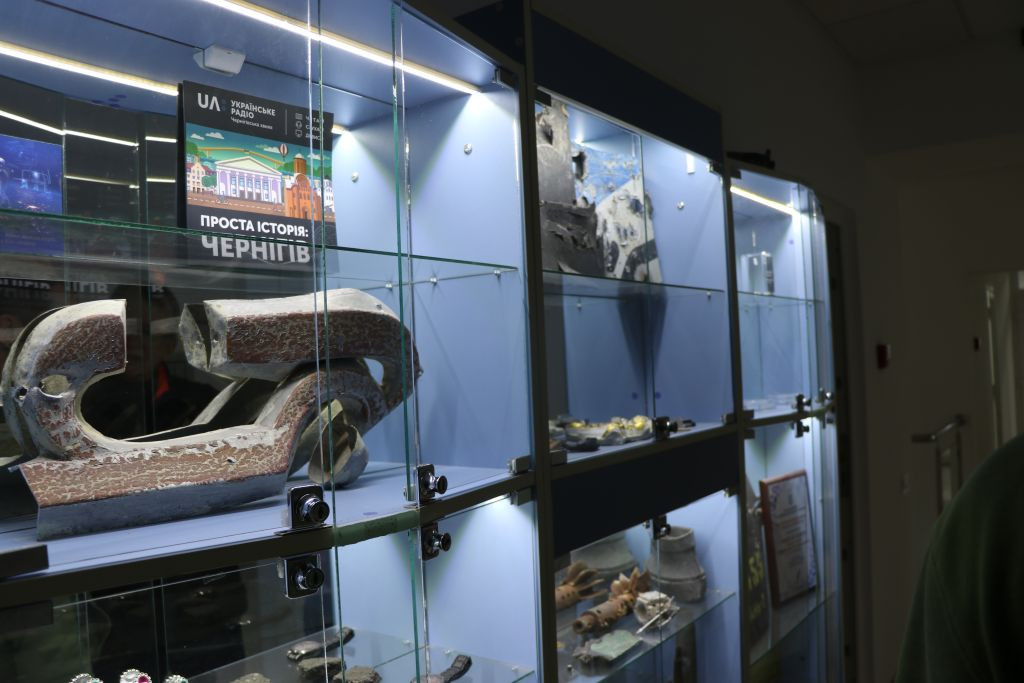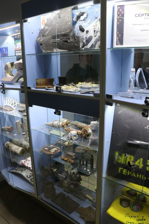 Andriy Titok führt uns anschließend ein wenig im Haus herum und erzählt von der Arbeit während der russischen Okkupation im Frühjahr 2022, das Haus war da gerade frisch renoviert und sie konnten nicht richtig arbeiten. In Vitrinen liegen Gegenstände, die an die Zeit im Frühjahr 2022 erinnern. Andriy Titok ist Produzent der Video-Dokumentationen Die Schlacht um Tschernihiw über die Zeit der Belagerung der Stadt Tschernihiw im Frühjahr 2022. In einem Interview erzählt Andriy von der Produktion der Dokumentation und der Zeit der Belagerung (Text im Original und in deutscher Übersetzung). Wer die Menschen in der Region Tschernihiw verstehen will, was sie erlebt haben und warum sie um ihre Freiheit kämpfen, der muss sich mit den Erfahrungen der Menschen in der Zeit der Belagerung auseinandersetzen, so schwer die Bilder auch zu ertragen sind.