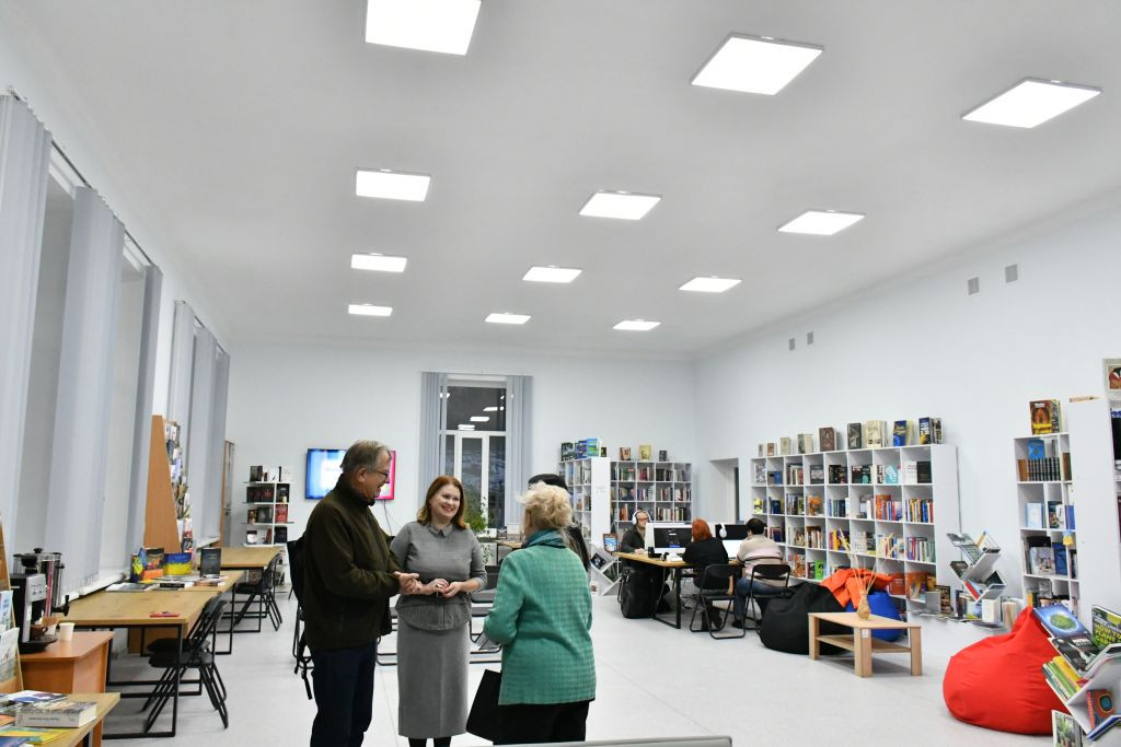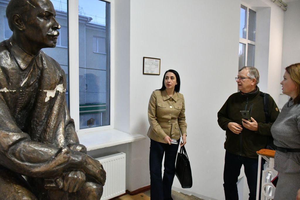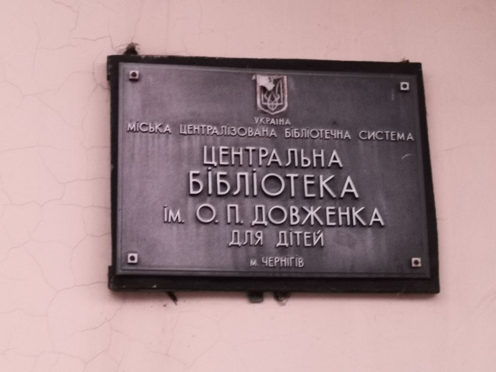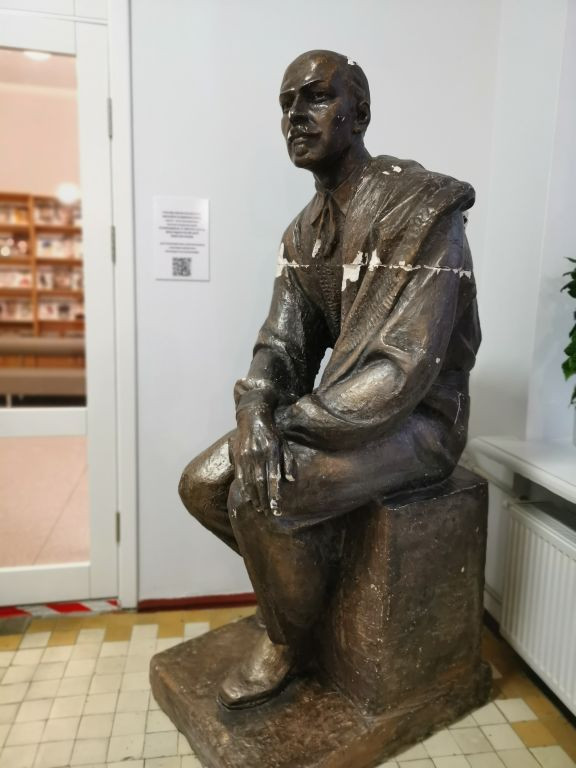 In der Stadtbücherei Tschernihiw werden wir von der Leiterin Ganna Puschkar / Ганна Пушкар begrüßt. Das Gebäude ist sichtlich neu renoviert und modern ausgestattet. Wir gehen die Treppe hinauf in den ersten Stock, wo auf dem Treppenabsatz eine Statue eines sitzenden Mannes steht, die einen Riss in der Mitte hat. Während der russischen Okkupation im Frühjahr 2022 war die obere Hälfte der Statue abgebrochen und herunter gefallen. Jetzt sind die Teile wieder zusammengefügt, der Riss in der Mitte bleibt sichtbar. Mir kommt die Statue sehr bekannt vor. Ich kenne sie von einem Bild aus der Ausstellung „Tschernihiw, Bericht aus einer belagerten Stadt“, die in Schwerin und Neubrandenburg gezeigt worden ist. Wir gehen in einen größeren Lesesaal, der auch zwei Computer-Arbeitsplätze hat. Hier können Leute auch arbeiten, wenn zuhause wegen Stromausfall und fehlendem Diesel-Generator der Computer nicht läuft.