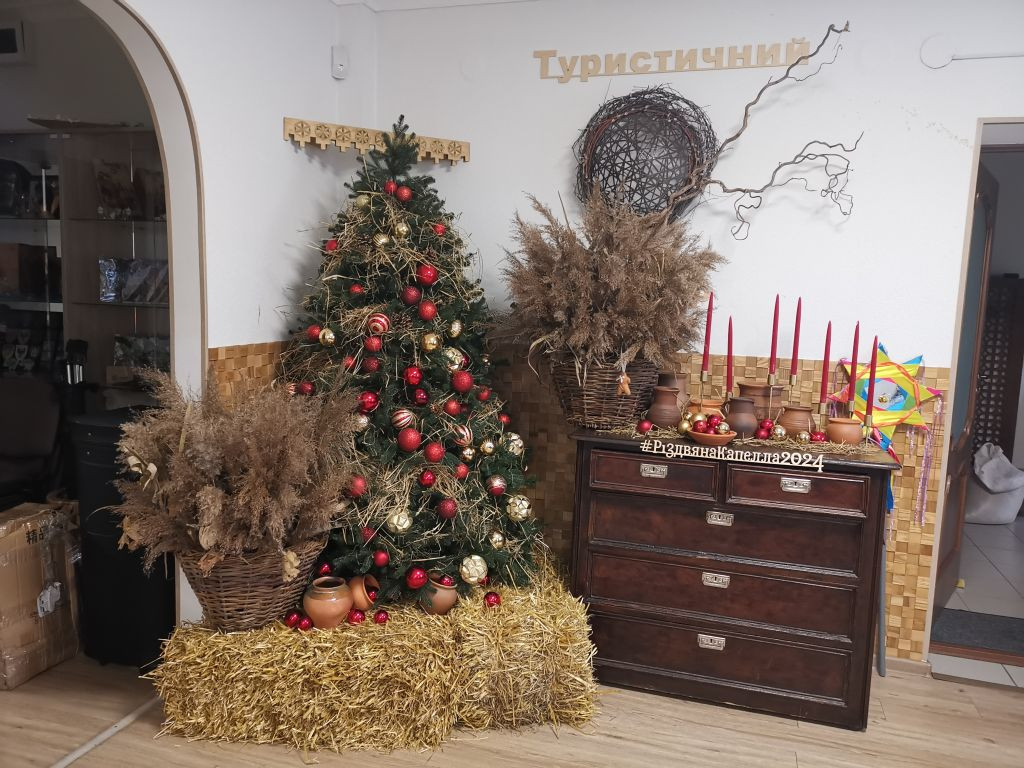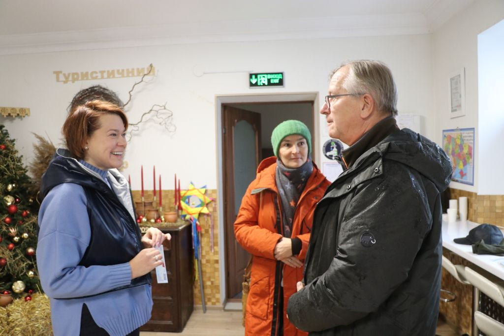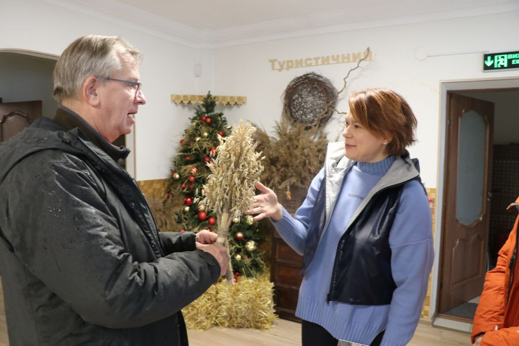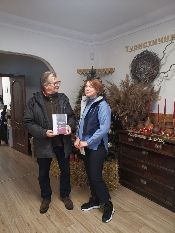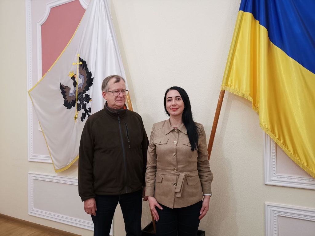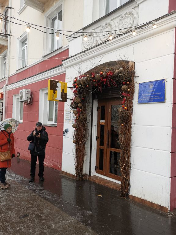 Jetzt schnell zurück zum Hotel, um 15 Uhr habe ich mit Nataliia Kholchenkova die nächste Verabredung im Rathaus von Tschernihiw, in der Nähe des Krasna-Square am Rande eines kleinen Parks. Vorher hole ich noch den Adventsschmuck von Kateryna aus der Tourist-Information ab. Kateryna ist nicht mehr da, aber der Adventsschmuck ist in einem Karton eingepackt und die beiden anwesenden Damen nehmen gerne mein Mitbringsel für Kateryna entgegen, einen Bildband von Mecklenburg-Vorpommern.