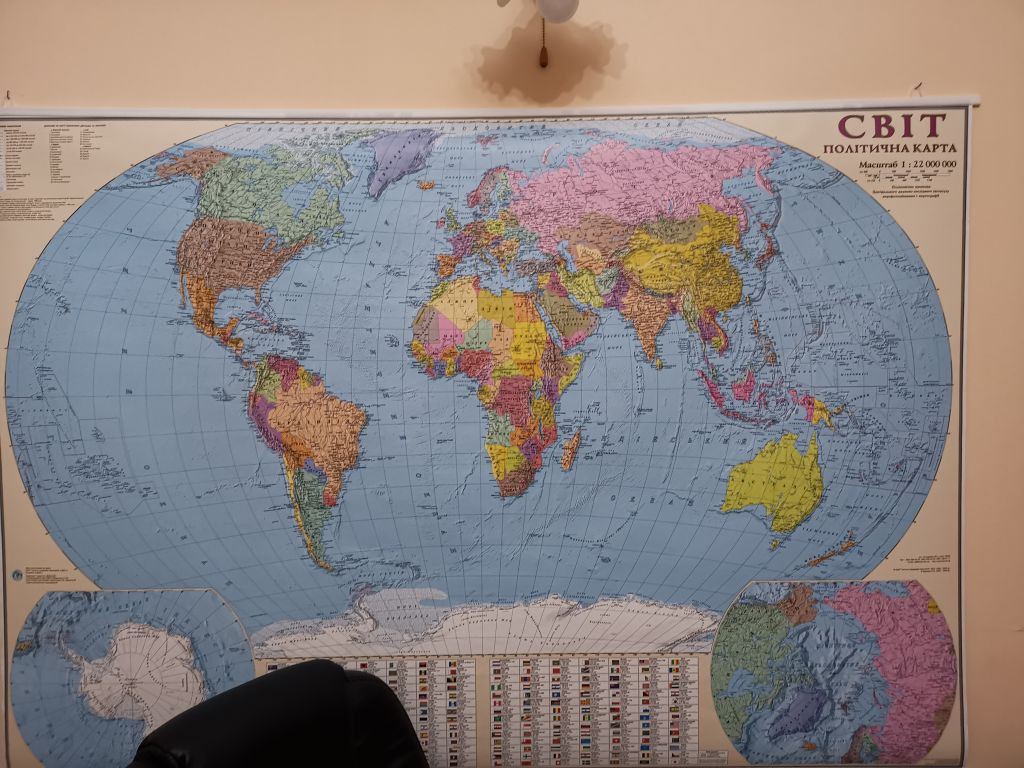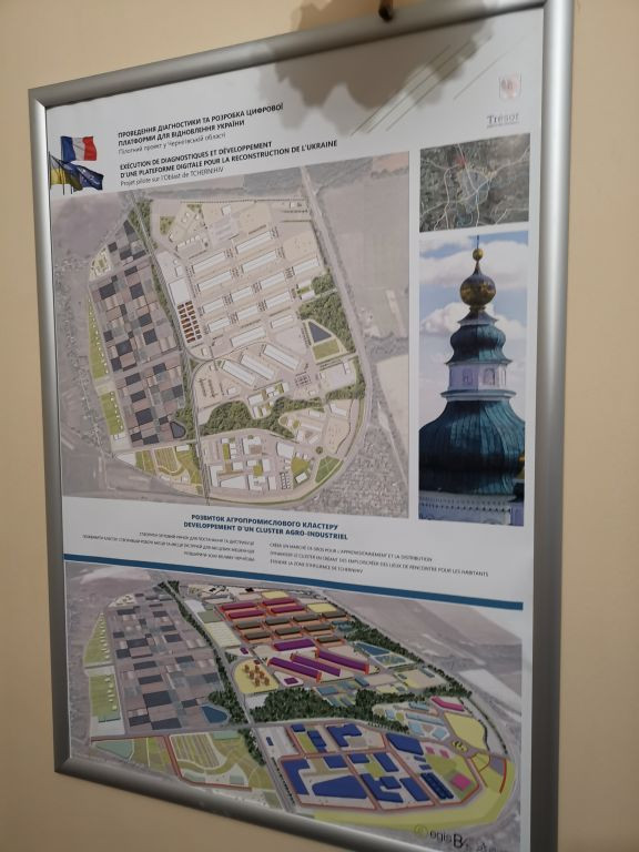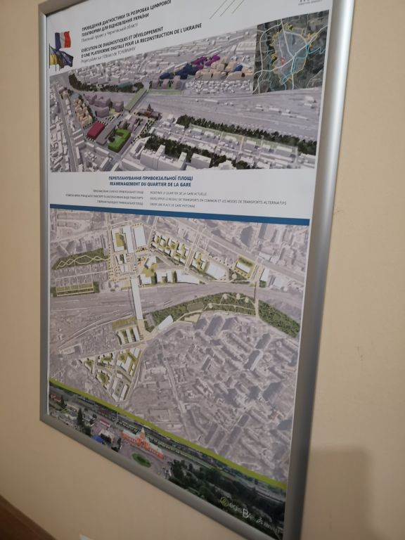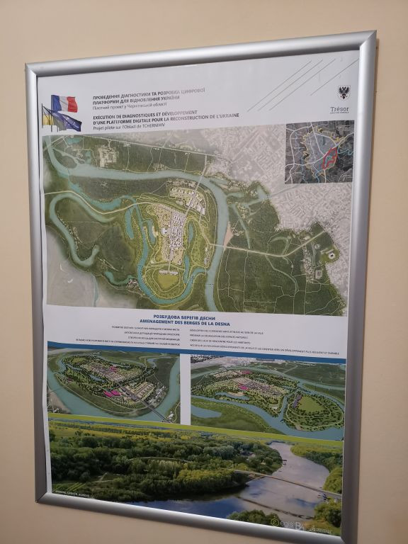 Wir nehmen an einem längeren Tisch Platz, Nataliia macht einen Kaffee. An der Wand gegenüber hängt kein Stadtplan von Tschernihiw, sondern eine ukrainische Weltkarte. Symbolisch! Hinter mir an der Wand sind Pläne für die Stadtentwicklung aufgehängt, Illustrationen, die Entwicklungsprojekte veranschaulichen.