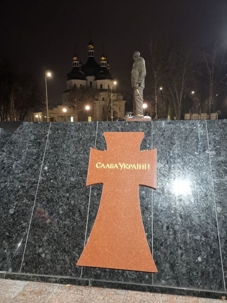 Das timing hat gut geklappt, ich komme mit dem Kleinbus wieder zurück zur Rathaus und Kateryna bringt mich ein paar Hundert Meter am Park entlang, wo wir vor dem neuen Denkmal für die gefallenen Soldaten auf Julia treffen wollen. Unterwegs sehen wir ein Hochzeitspaar, dass bei schönstem Sonnenschein im Park ein paar Hochzeitbilder lassen machen will.