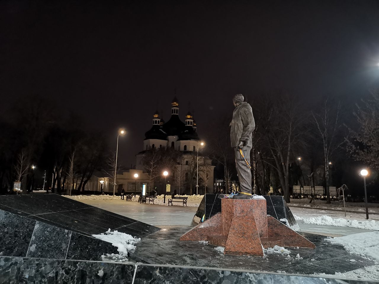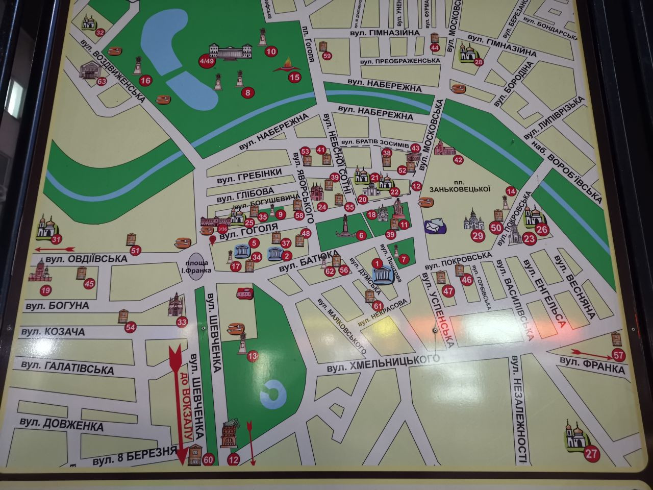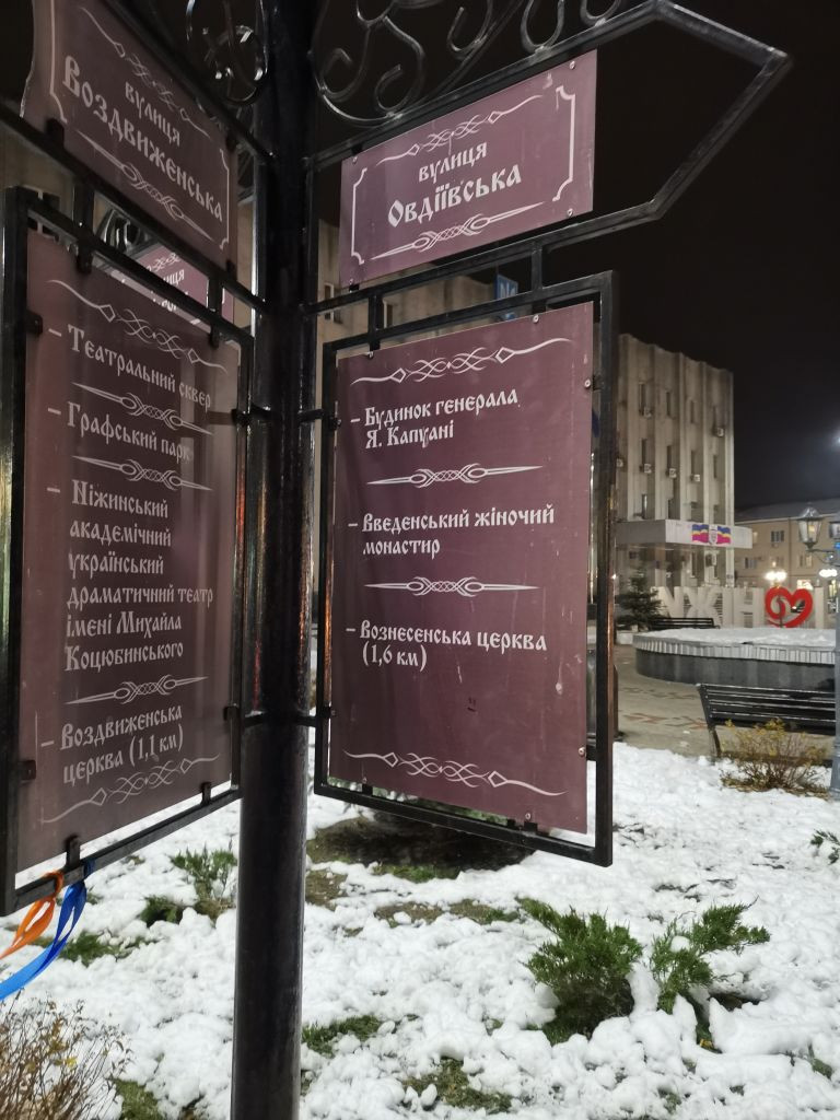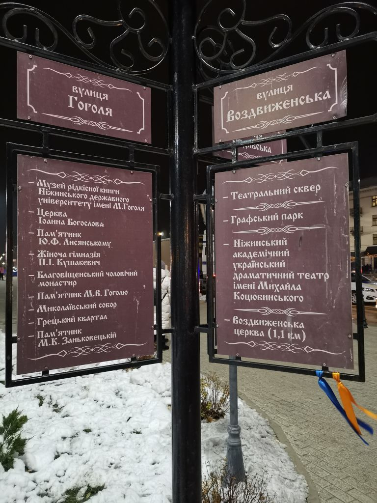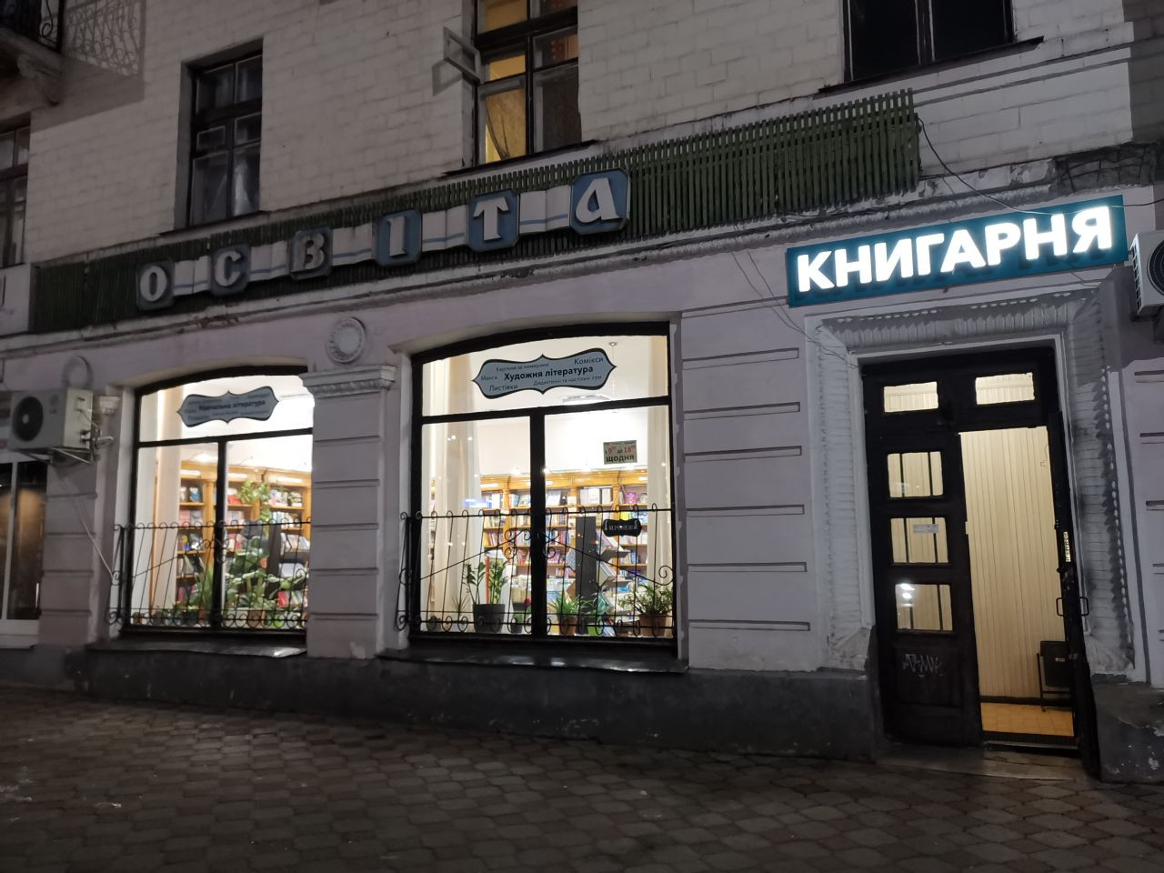 Nach dem Schulbesuch streife ich durch das schon abendliche Nizhyn zum Hotel zurück. Auch ohne google maps finde ich nach und nach den Weg. Am zentralen Platz vor dem Rathaus sehe ich noch eine Buchhandlung, die geöffnet ist. Ich kann nicht widerstehen, gehe rein und finde ein Buch über die ukrainische Geschichte auf Englisch. Es ist wie ein Comic gestaltet, eine grafic novel. Ich kaufe dieses Buch und ein paar Karten, die die Ukraine thematisch darstellen. Wo werde ich dafür zuhause noch einen freien Platz an der Wand finden?