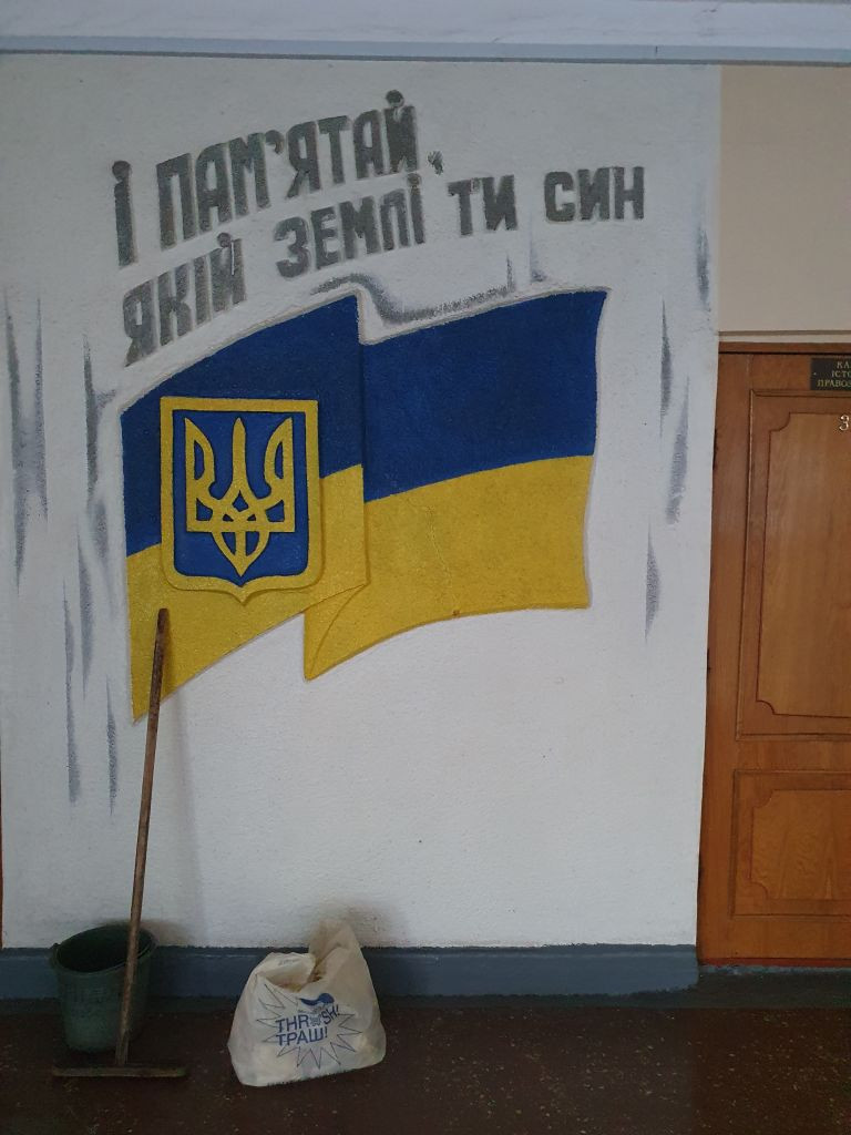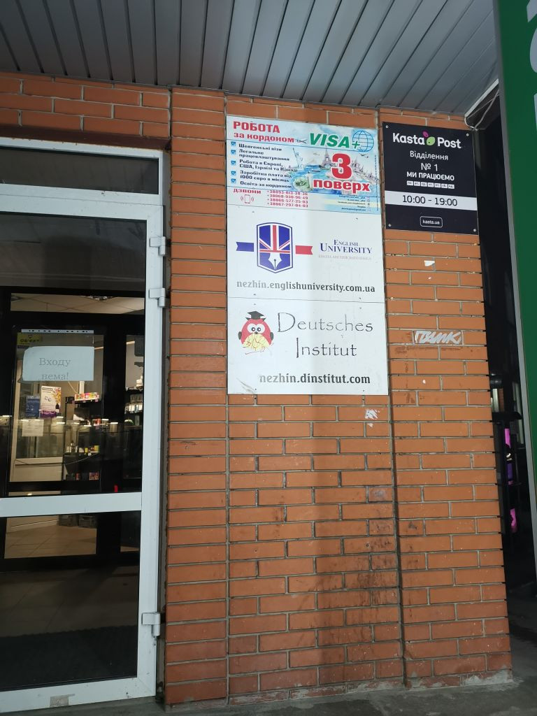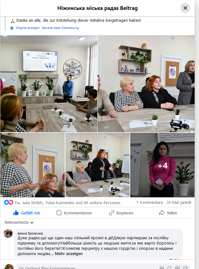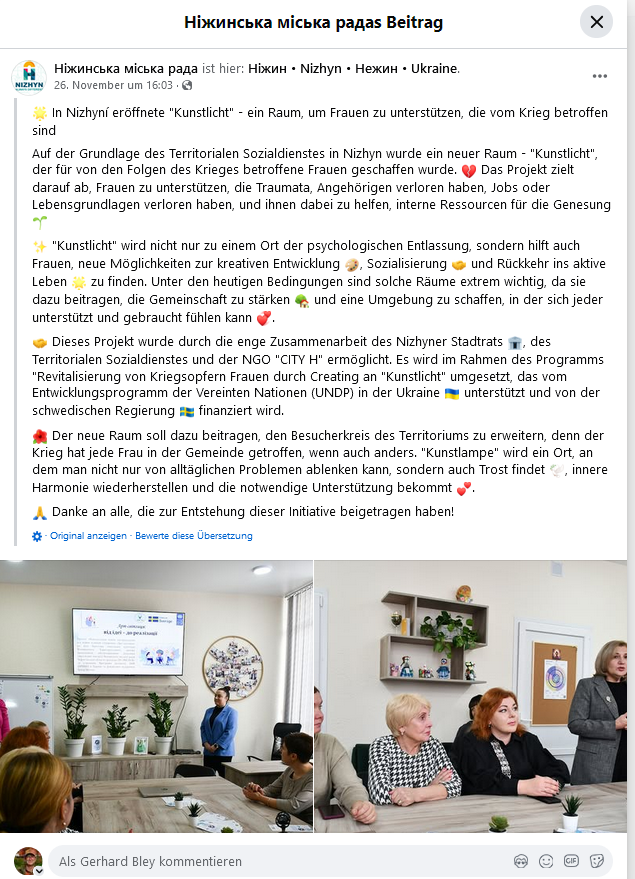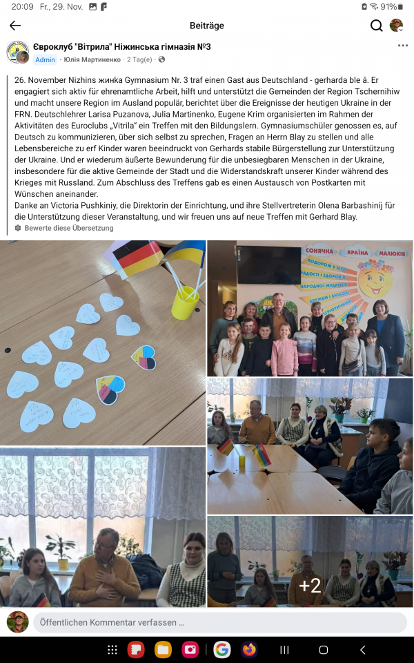 Am nächsten Tag sehe ich einen Post auf der Facebook-Seite des Stadtrats Nizhyn zu meinem kurzen Besuch beim Bürgermeister (Ehrenamtler Bley besucht Nizhyn…). Mein Eindruck ist, dass es richtiger Weise bei meinem kleinen Besuch beim Bürgermeister und dem Facebook-Post danach weniger um mich als Person als um ein Signal der Solidarität und der Zusammengehörigkeit nach innen, in die Bevölkerung von Nizhyn hinein, geht. Die Nizhyn Post, ich kenne sie bereits als online-Zeitung, bringt am übernächsten Tag einen kleinen Beitrag, auch mit Bildern aus dem 3. Gymnasium, das ich später besuche.