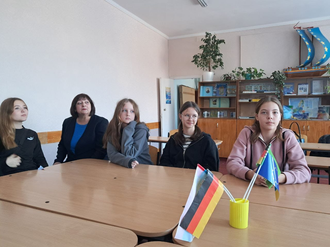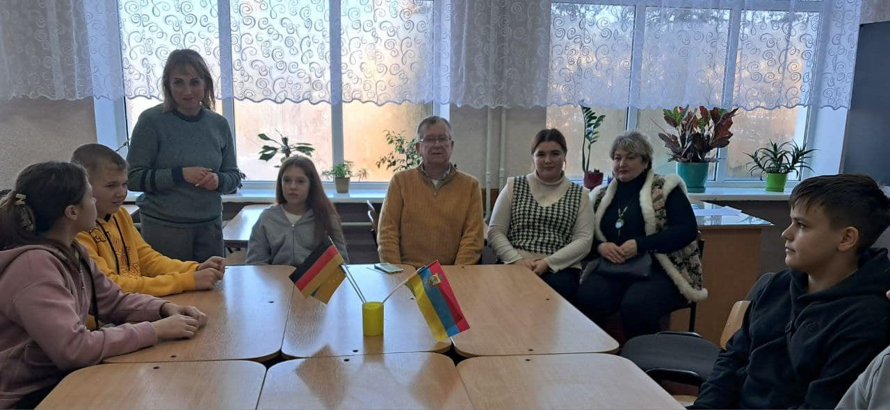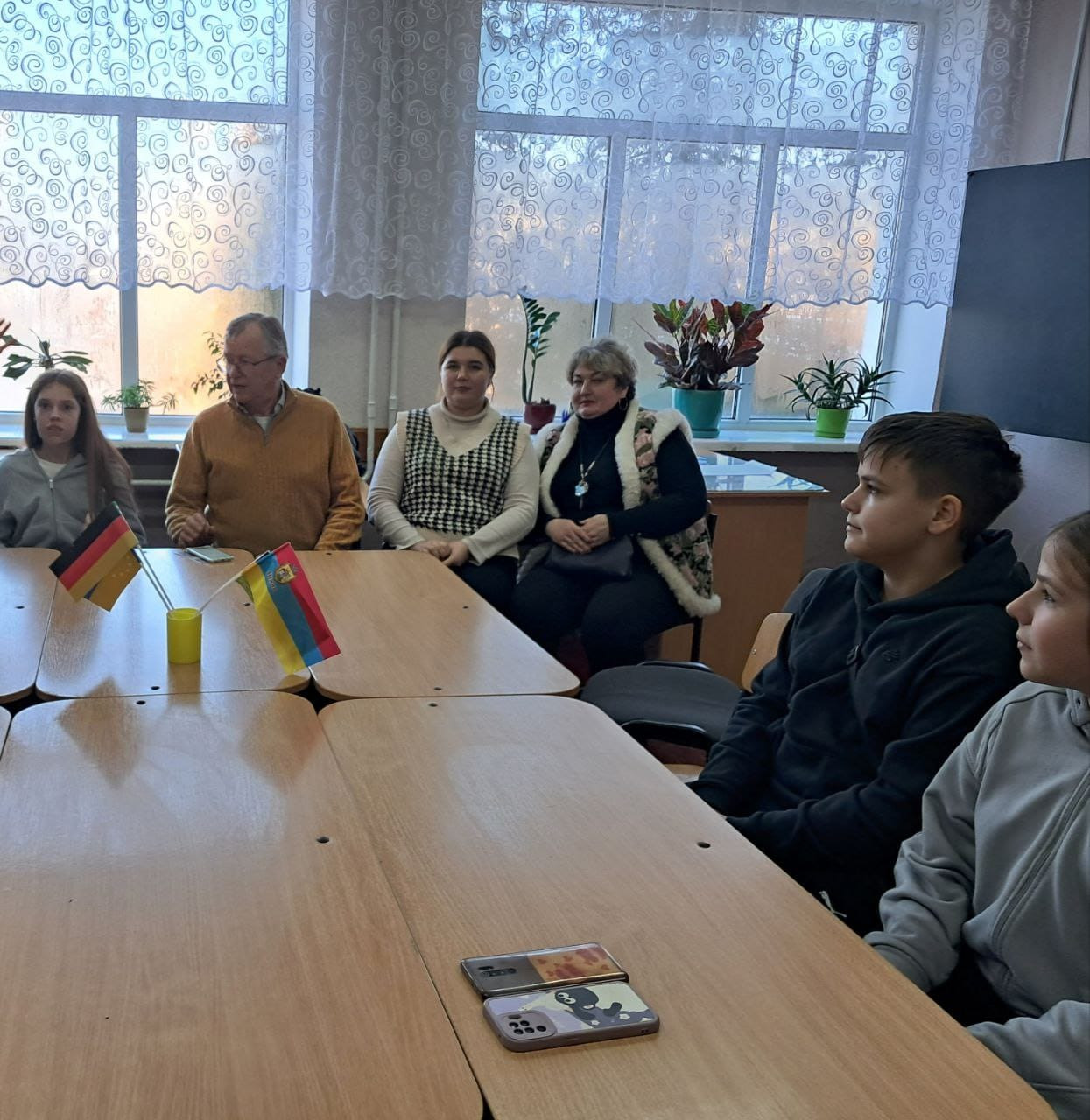 Mit Julia geht es zum 3. Gymnasium, an dem ich im Mai 2024 schon einmal gewesen bin. Wir gehen vielleicht eine Viertelstunde an den nördlichen Rand der Innenstadt undwerden in der Schule von der Schulleiterin, ihrer Stellvertreterin Olena und einer weiteren Deutschlehrerin empfangen. Vorbei an ausgestellten Bildern von SchülerInnen geht es in einen Klassenraum, wo bereits ein Gruppe von Jugendlichen auf uns warten, die an der Schule Deutsch lernen und sich gut auf das folgnede Gespräch vorbereitet haben. Welche Hobbies habe ich, was habe ich beruflich gemacht, was ist ein typisches deutsches Essen - ich weiss nicht, was ich hier sagen soll, wo wohne ich? Auf einer Landkarte an der Wand mit den deutschen Bundesländern zeige ich Mecklenburg-Vorpommern. Sind wir hier in einem Deutsch-Fachraum?