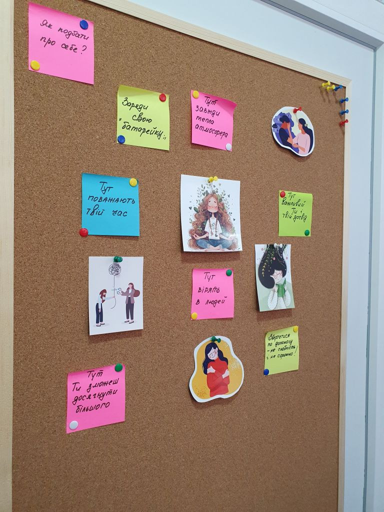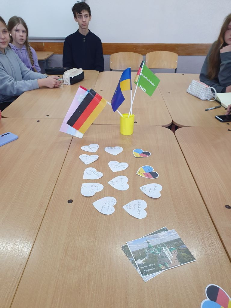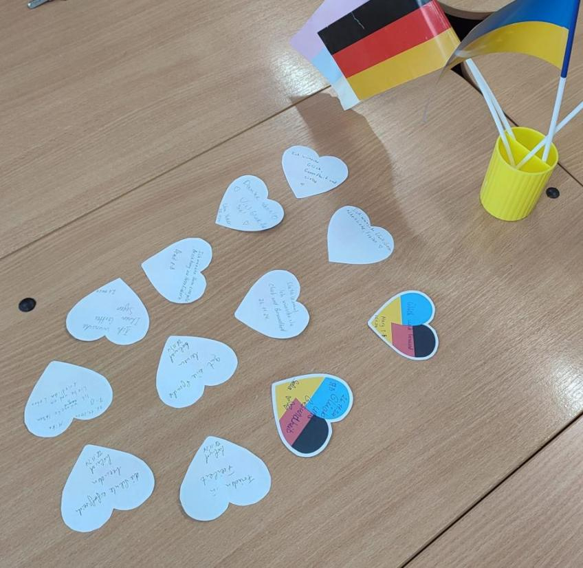 Zu Schluss werden kleine aus Papier ausgeschnittene Herzen mit den ukrainischen Nationalfarben verteilt und alle schreiben Wünsche auf die Rückseite. Ich bekomme viele kleine Herzen als Geschenk mitgegeben.