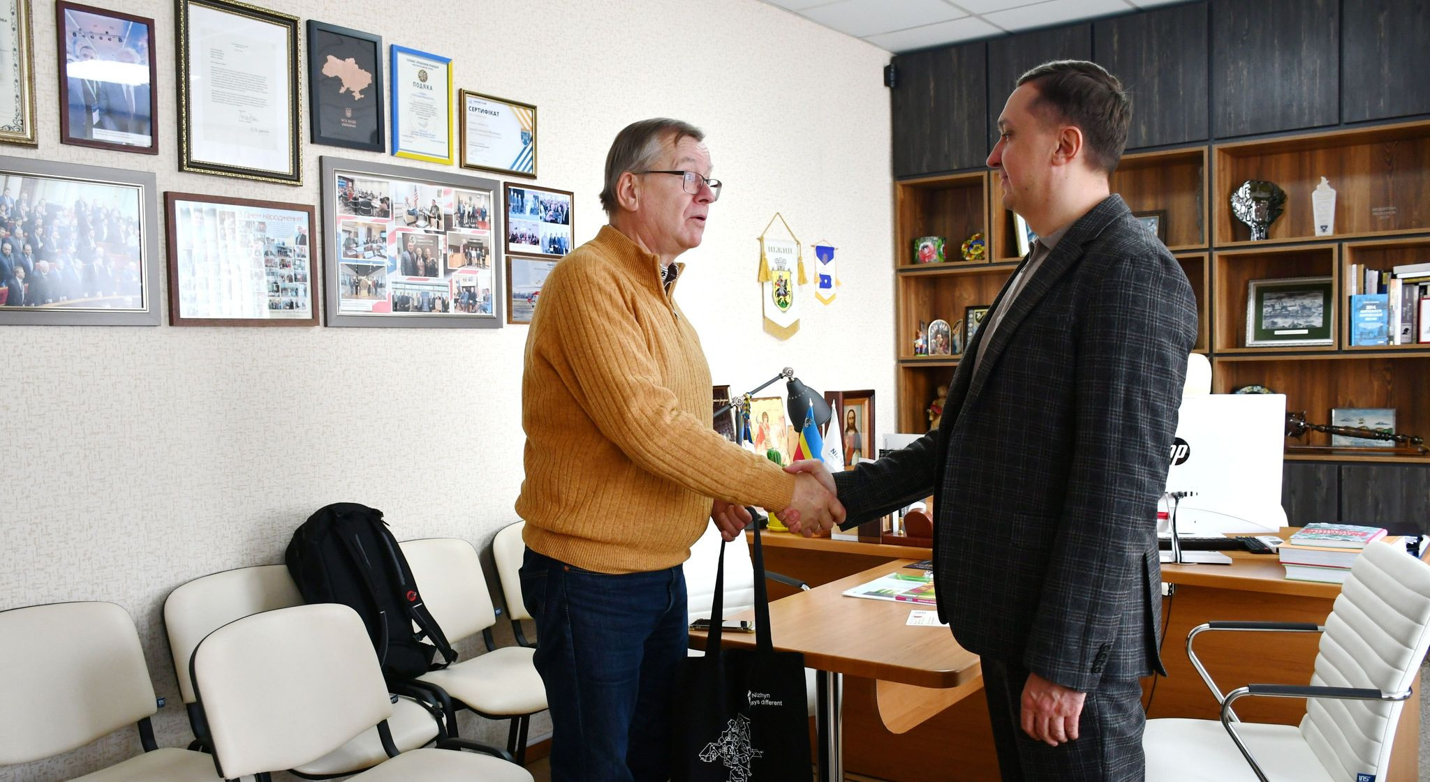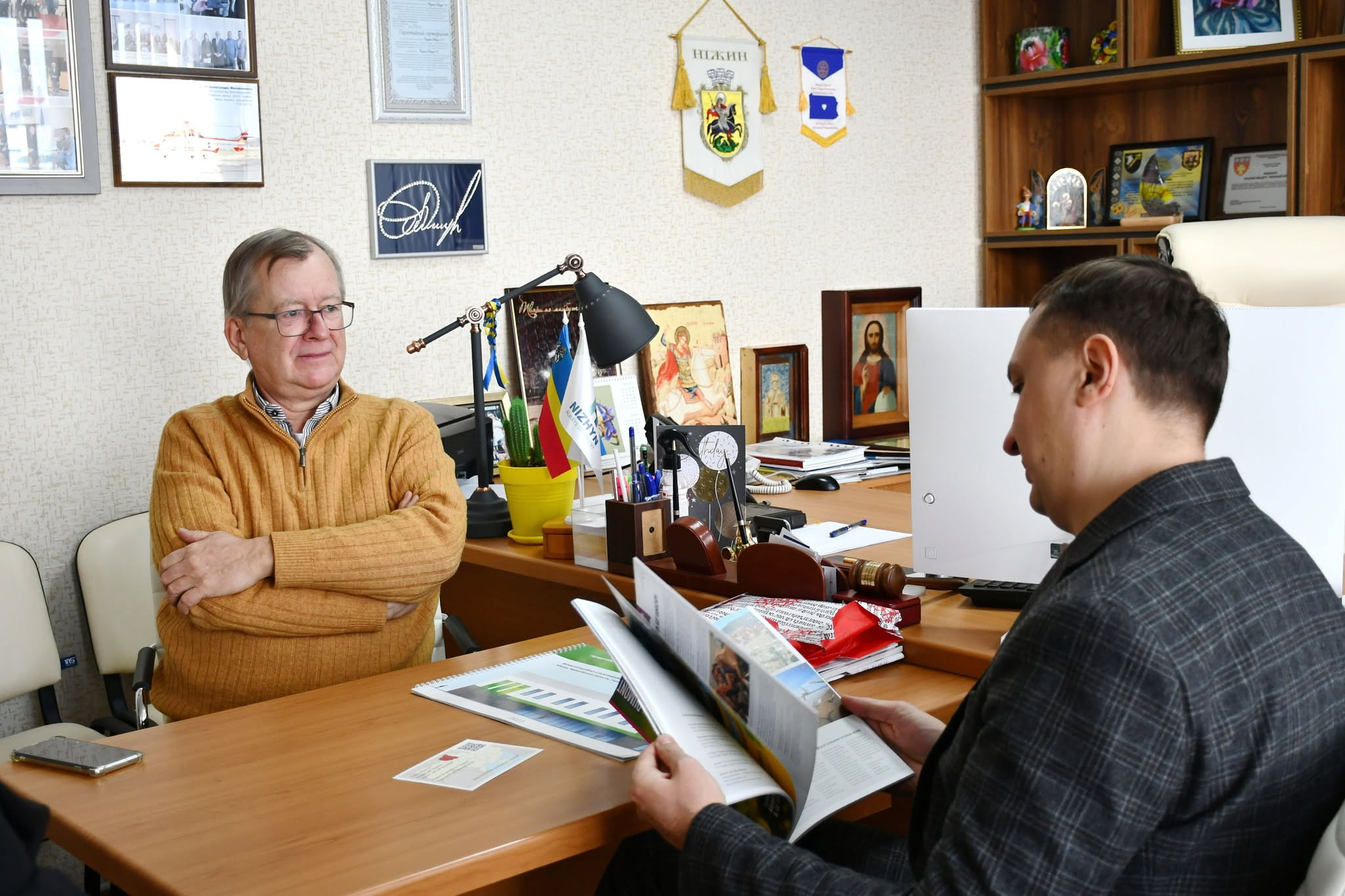 Es gibt ein kurzes Gespräch, ich stelle mich kurz vor und versuche zu verdeutlichen, was mein Anliegen ist. Eine Fotografin ist gleich mit ins Amtszimmer gekommen, ich überreiche einen kleinen Bildband über die Ostseeküste von Mecklenburg-Vorpommern, bekomme eine Tasche mit Souvenirs von Nizhyn und es werden ein paar Bilder gemacht.