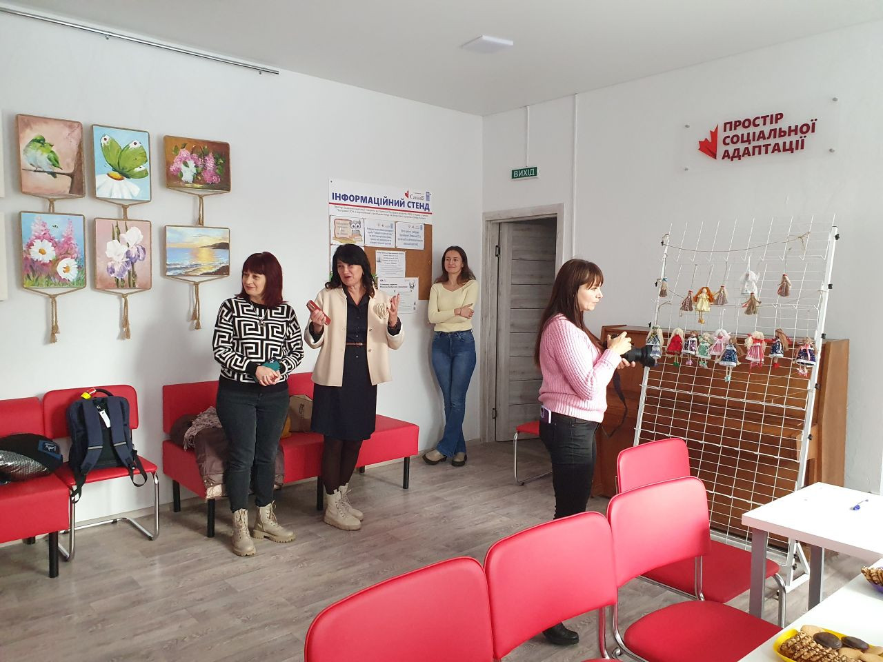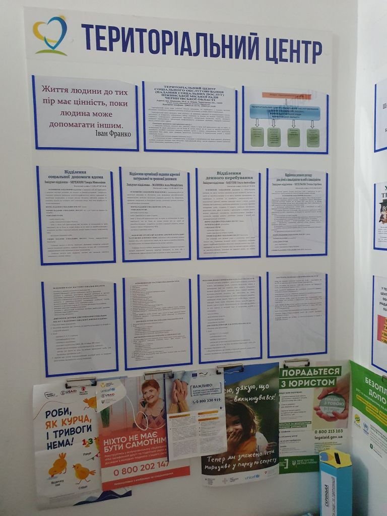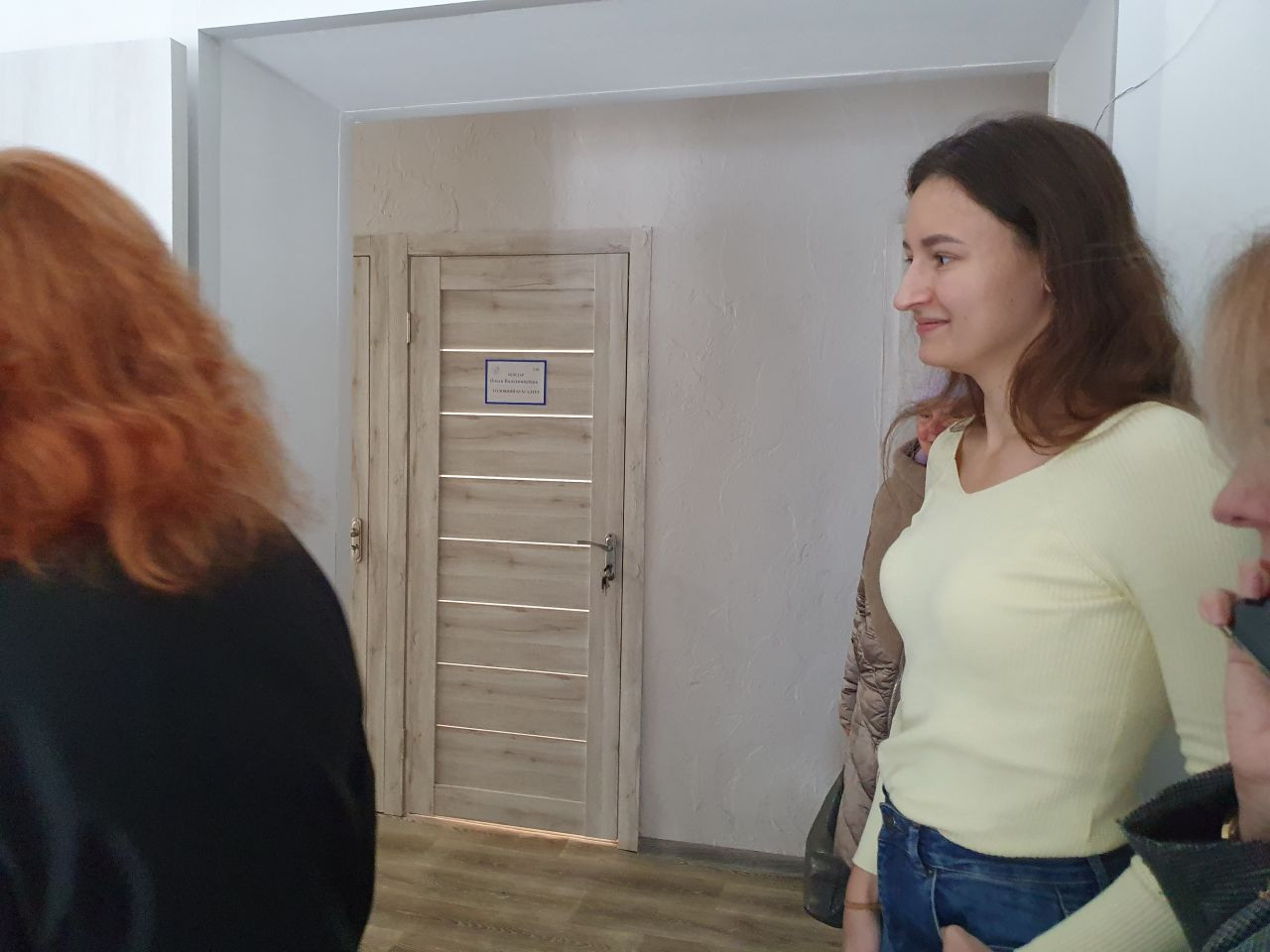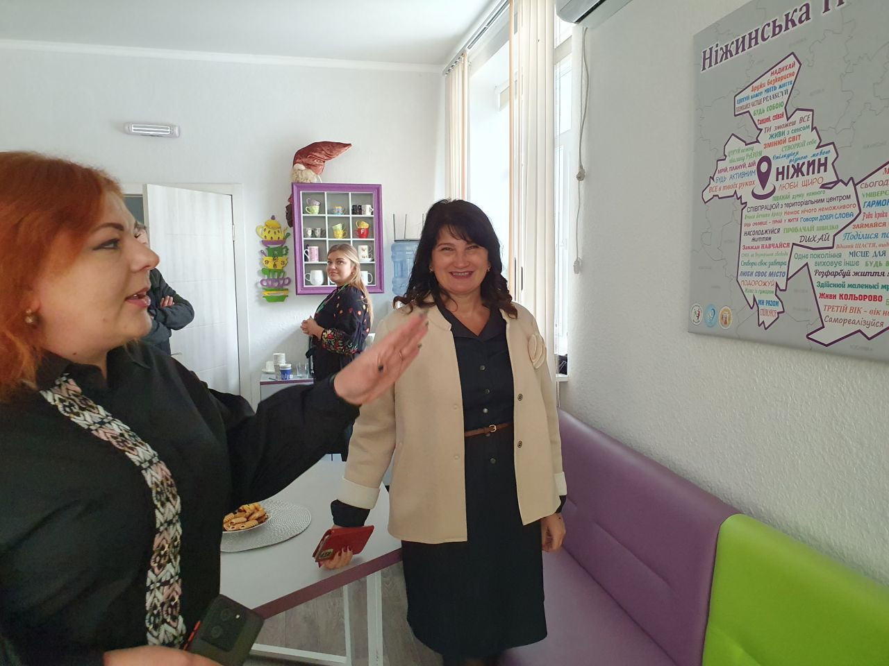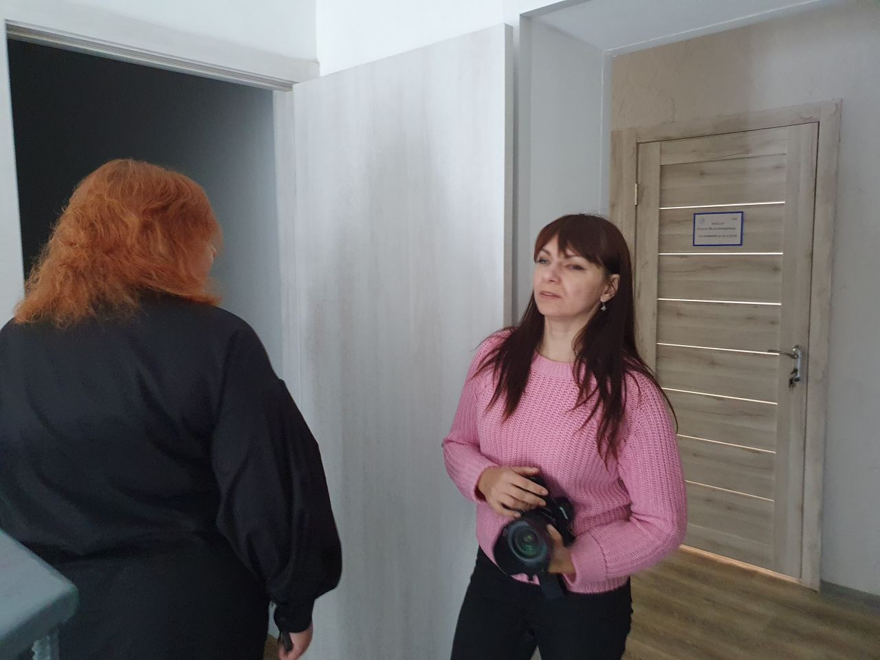 Zurück zum Rathaus übernimmt Kateryna jetzt meine Begleitung. Vor dem Rathaus wartet ein Kleinbus und ich fahre mit einer Gruppe zu einem sozialen Zentrum zur Unterstützung von Frauen, das gleich eröffnet werden soll. Im Bus sind wohl Vertreterinnen des Stadtrates von Nihzyn und aus der Stadtverwaltung. Später kommen noch weitere Besucher aus der Stadt-Community hinzu.