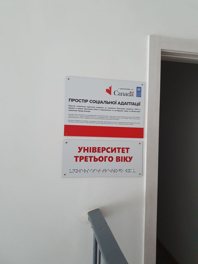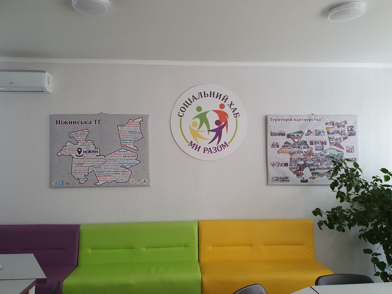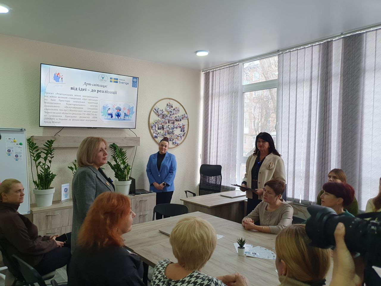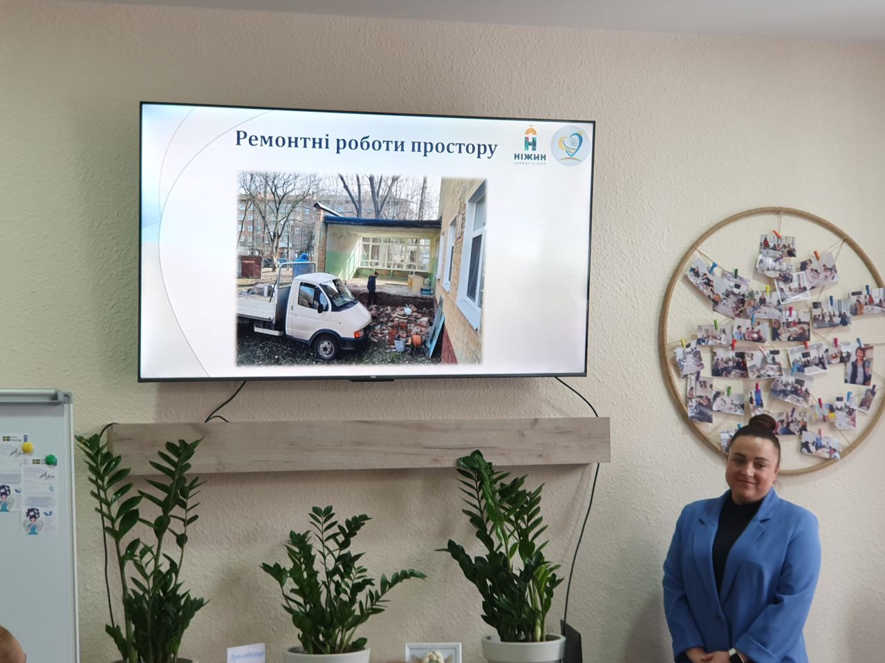 Zurück zum Rathaus übernimmt Kateryna jetzt meine Begleitung. Vor dem Rathaus wartet ein Kleinbus und ich fahre mit einer Gruppe zu einem sozialen Zentrum zur Unterstützung von Frauen, das gleich eröffnet werden soll. Im Bus sind wohl Vertreterinnen des Stadtrates von Nihzyn und aus der Stadtverwaltung. Später kommen noch weitere Besucher aus der Stadt-Community hinzu.