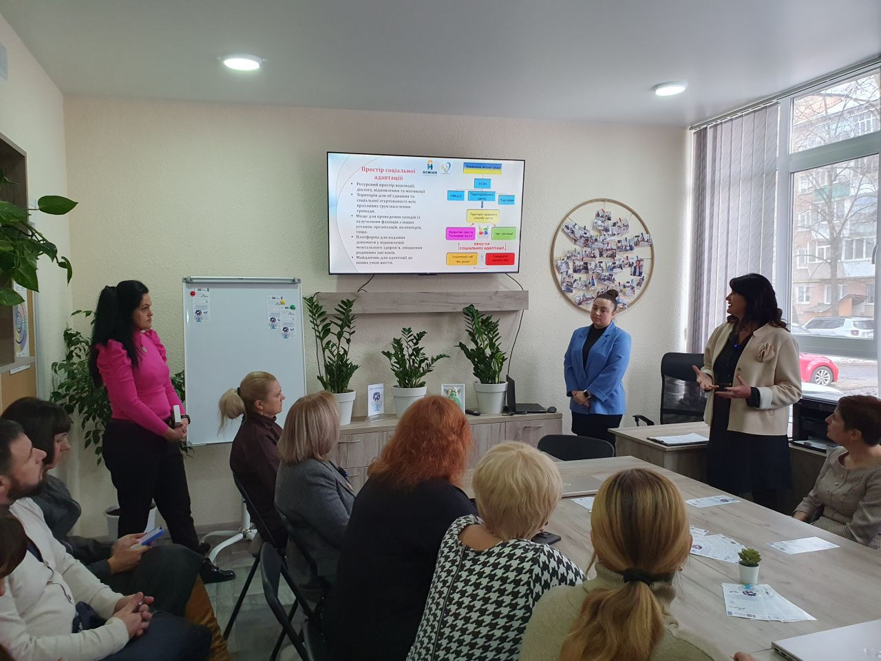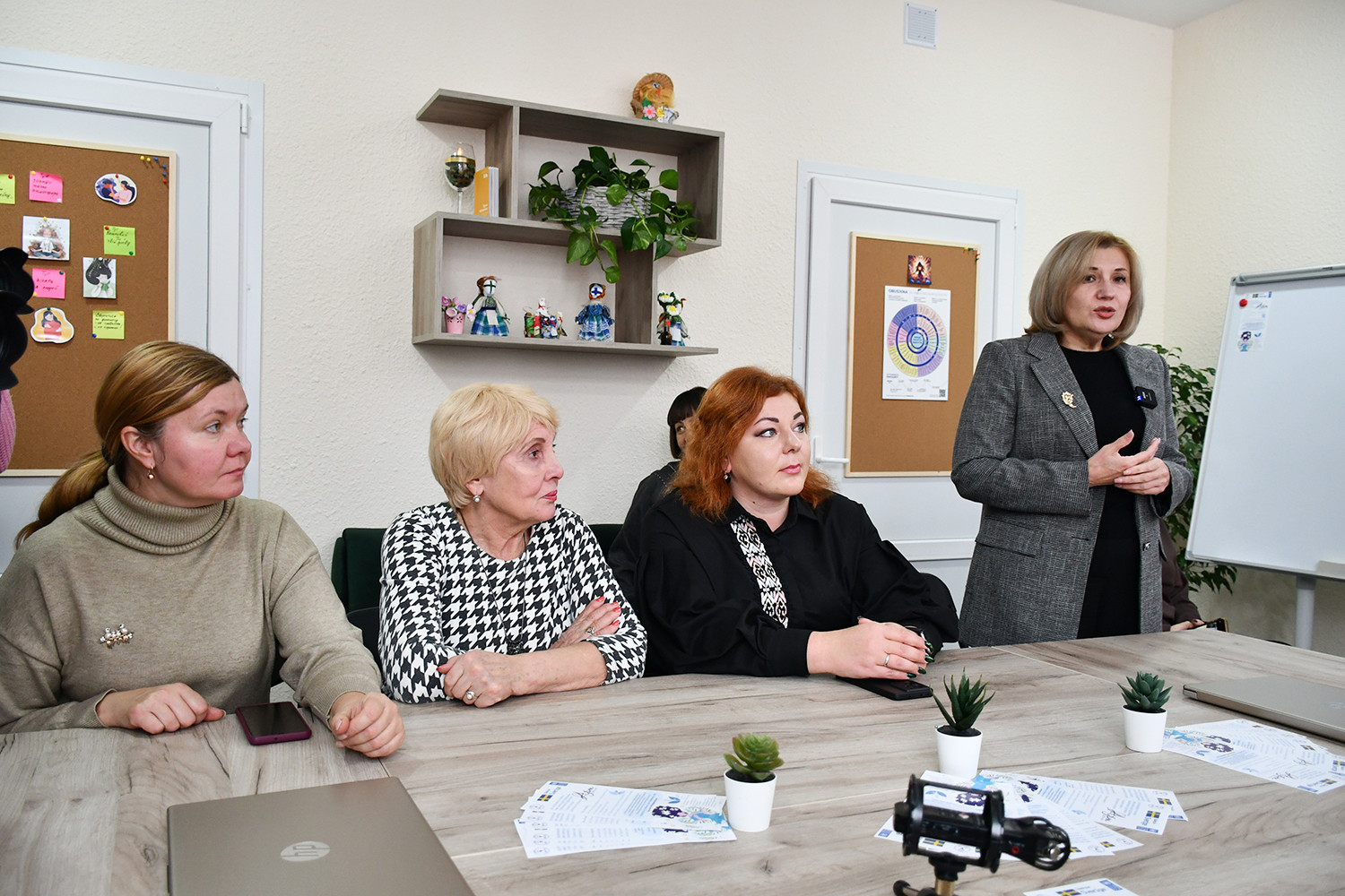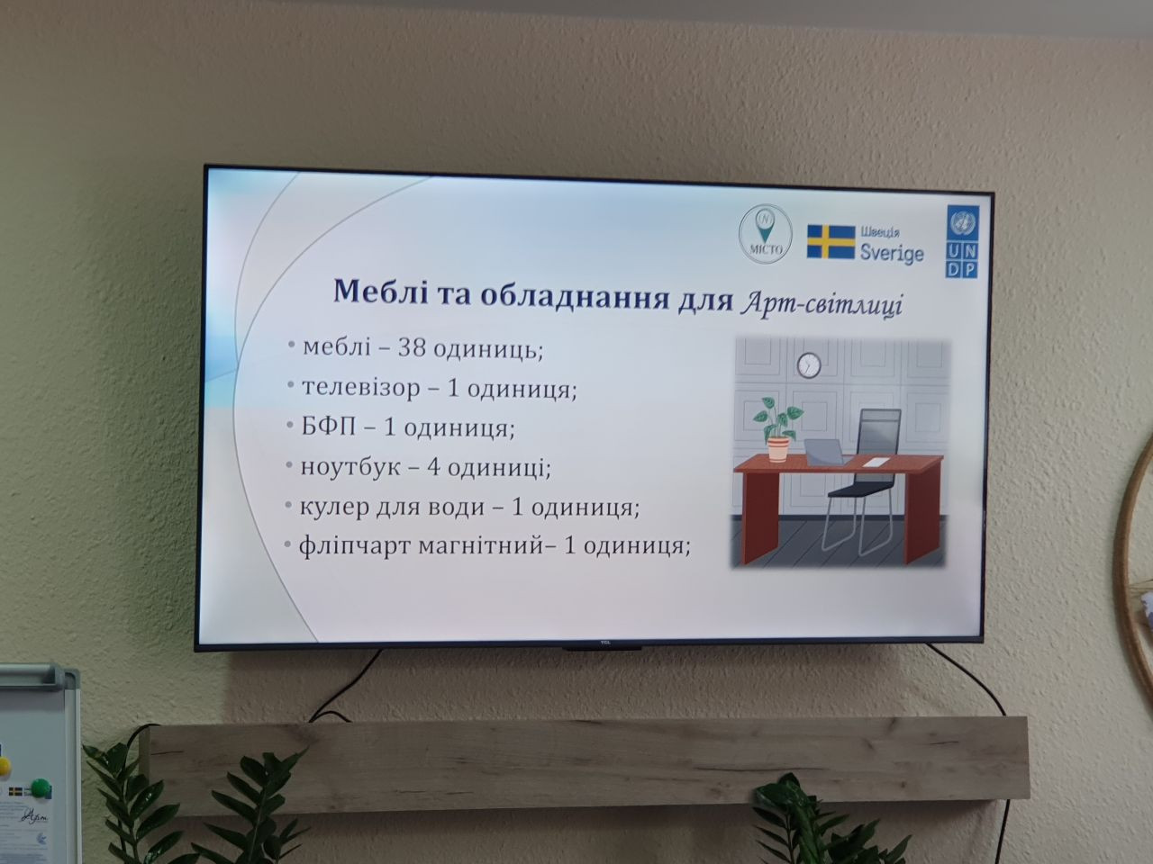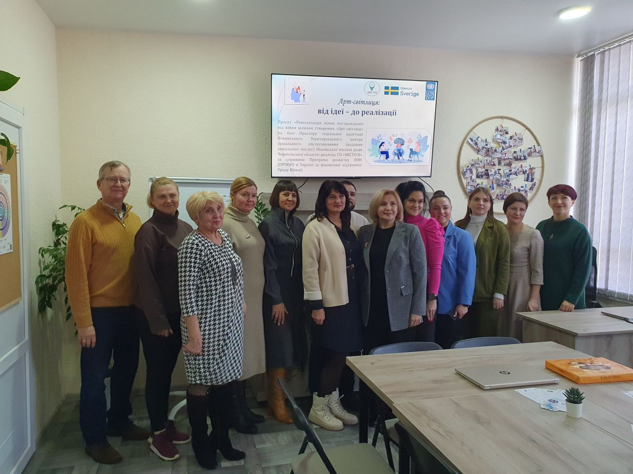 Zurück zum Rathaus übernimmt Kateryna jetzt meine Begleitung. Vor dem Rathaus wartet ein Kleinbus und ich fahre mit einer Gruppe zu einem sozialen Zentrum zur Unterstützung von Frauen, das gleich eröffnet werden soll. Im Bus sind wohl Vertreterinnen des Stadtrates von Nihzyn und aus der Stadtverwaltung. Später kommen noch weitere Besucher aus der Stadt-Community hinzu.